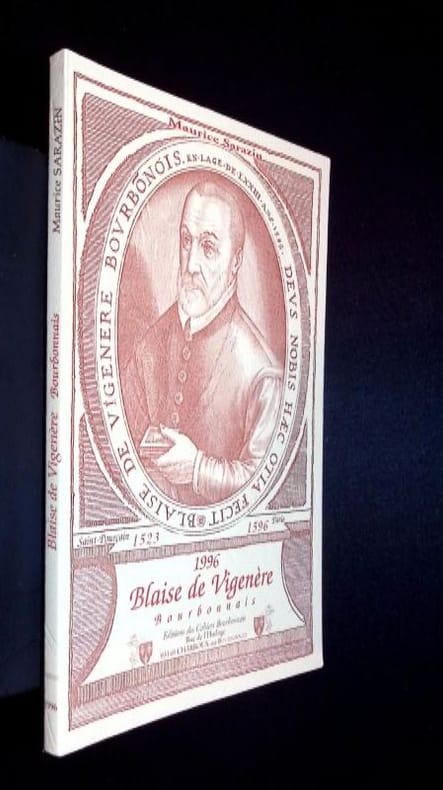 Biographie de cet humaniste français (1523-1596) né à Saint-Pourçain-sur-Sioule et présentation bibliographique de ses oeuvres publiées entre 1573 et 1618. Maurice Sarazin est l'actuel bibliographe du Bourbonnais, en digne successeur de Maurice Duportet (1899-1962).Cette étude a ainsi été conçue et imprimée en Bourbonnais, son duché natal dont il tirait une évidente fierté au point de faire suivre son patronyme de cette qualité patrimoniale dans tous ses ouvrages. Ce travail de recherche retrace la vie et l'uvre de cet humaniste français de la Renaissance qui marqua son siècle et ouvrit les chemins de la connaissance que les lettrés redécouvrent aujourd'hui.Hommage est ainsi rendu à Blaise de Vigenère, infatigable voyageur européen. Hommage à cette « tête bien faite » comme l'entendait Michel de Montaigne, son cadet de dix années. Ecrivain, poète, traducteur (il pratiquait cinq à six langues), alchimiste, kabbaliste, archéologue, diplomate, historien, conseiller des princes et des rois, Blaise de Vigenère fut tout cela et son uvre est immense.Blaise de Vigenère est inhumé dans la chapelle commémorative de l'église Saint-Etienne du Mont, dans le Ve arrondissement, située derrière le Panthéon.La présente édition est dédiée aux collégiens et lycéens du Bourbonnais et de France, et en particulier à ceux du lycée qui porte son nom. Franco de port France jusqu'à 29 euros iclus. PAYPAL immédiat. MONDIAL RELAY pour : FRANCE, Portugal, Pologne, Espagne, Allemagne, Autriche, Pays Bas, Luxembourg, Italie, Belgique. Toutes les étapes sont accompagnées. Achat, estimations et listages (Papiers, Archives, monographies, arts et métiers, sciences humaines et bibliophilie) France / Suisse (sur rdv).