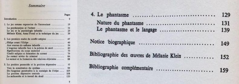 1ere édition Contents, Chapitres : Introduction - Le jeu comme expression de l'inconscient - Les premiers stades du conflit oedipien - La position paranoide et la position dépressive - Le phantasme - Notice biographique - Bibliographie des travaux de Mélanie Klein - Bibliographie complémentaire pliure sur le coin du plat inférieur de la couverture qui est tres legerement jaunie, intérieur sinon en bon état