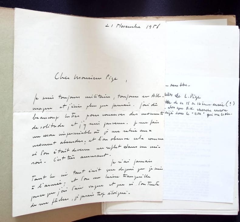 Lettre manuscrite adressée le 21 novembre 1956 au Poète Louis Pize, dont Roger Kowalski fut l'élève , et qui garde ici un ton de respect teinté d'une grande proximité affective. Roger Kowalski précéda Louis Pize dans la mort et décéda à l'âge de 41 ans. Dans cette lettre écrite à l'armée durant la guerre d'Algérie, il nous livre avec douceur de brefs épisodes de sa vie quotidienne, sa tentative infructueuse de publier chez Pierre Seghers qui ne boude pas son travail et plus tard d'ailleurs le publiera. Cette lettre, dans certains de ses détails, souligne en creux la sensibilité de cet homme alors seulement âgé de 22 ans. Précieux document.