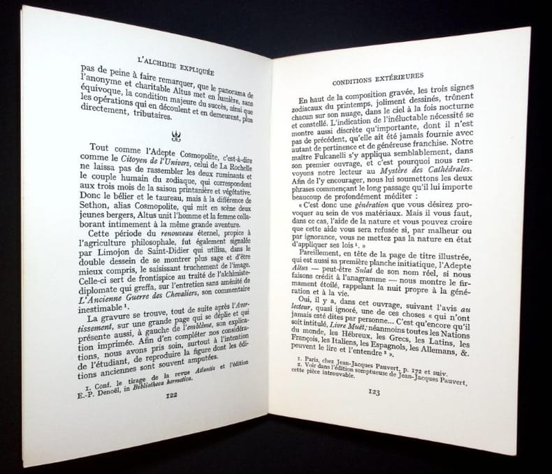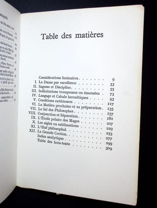 Paris, Jean Jacques Pauvert, 1972. In octavo; br., 310 pp., index analytique sur deux colonnes des mots et des noms de personnes, des termes, et des expressions particulières à l'alchimie, ainsi que des livres cités. Tranche marquée par des lectures itératives, frottement sans gravité, belle et bonne pagination. Bon état d'usage.