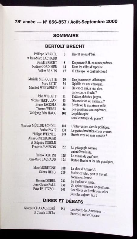Revue Europe, août-septembre 2000. In-8°, br., 347 pp., 249 pp., sont consacrées a B. Brecht. Dense.