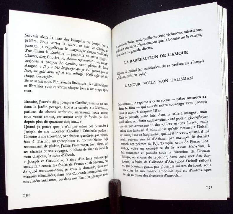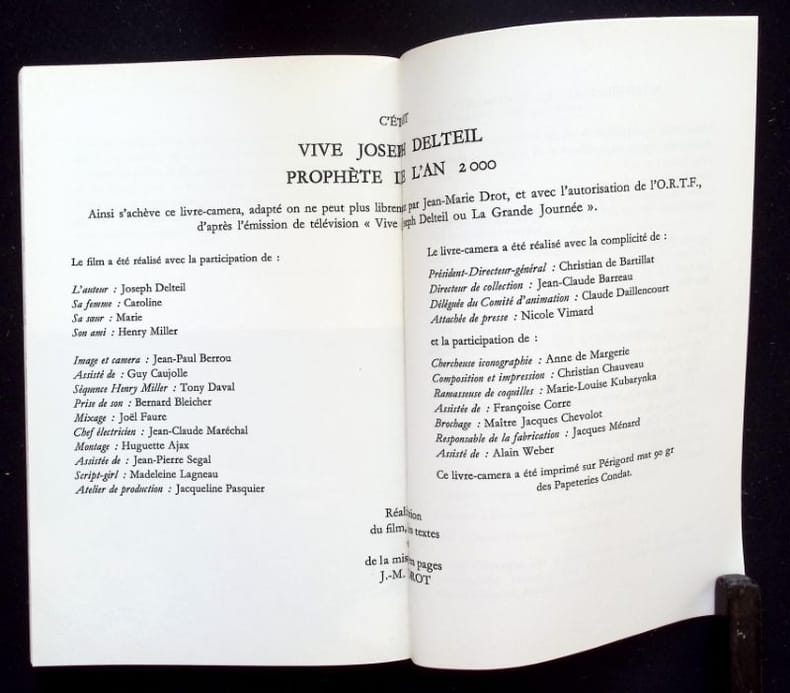 Paris : Editions Stock (Collection "Dire / Livre caméra"), 1973. Un volume broché (13x20,5 cm), 264 pages. Photographies, textes, dialogues et documents qui proposent une nouvelle lecture d'un film sur Joseph Delteil réalisé pour la télévision française en 1972. Tranches de la couverture légèrement poussiéreuses sinon bon état.