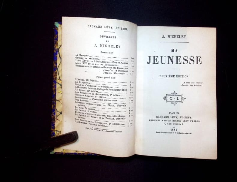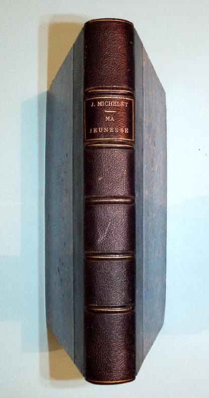 Edition Originale publiée par Madame Michelet. Dans son testament, Michelet avait non seulement légué tous ses pouvoirs à son épouse, mais de surcroît il lui avait laissé tout pouvoir quant à leur utilisation. Elle abusa de cette liberté, lorsqu'elle se mit en devoir de publier les oeuvres posthumes de son époux. Elle commença par tirer d'un manuscrit intitulé "Mémorial", ce volume qu'elle intitula "Ma jeunesse, en y apportant des corrections très personnelles. Elle fera de même en 1888 avec un recueil intitulé "Mon journal". Bon Etat Franco de port France jusqu'à 29 euros iclus. PAYPAL immédiat. MONDIAL RELAY pour : FRANCE, Portugal, Pologne, Espagne, Allemagne, Autriche, Pays Bas, Luxembourg, Italie, Belgique. Toutes les étapes sont accompagnées. Achat, estimations et listages (Papiers, Archives, monographies, arts et métiers, sciences humaines et bibliophilie) France / Suisse (sur rdv).