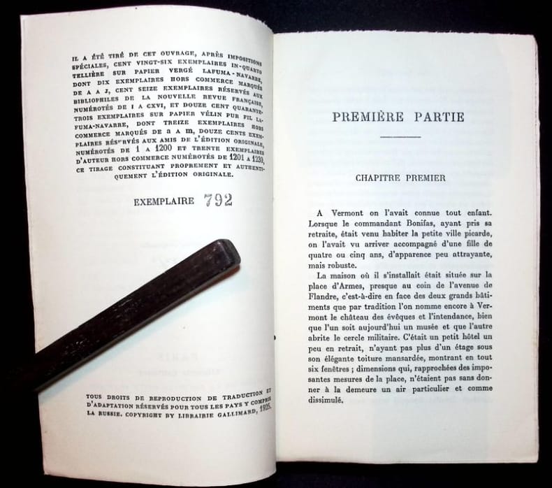 Gallimard In-12, broché, couverture éditeur, 359 pp, exemplaire numéroté, l'un des douze cent quarante trois sur pur fil Lafuma-Navarre, bon état ensemble.