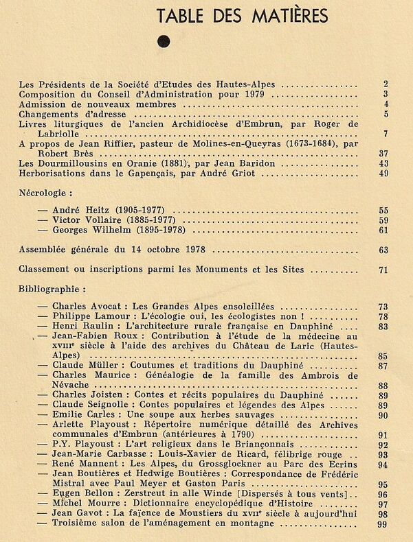 Au sommaire, entre autres : Livres liturgiques de l'ancien Archidiocèse d'Embrun ; A propos de Jean Riffier, pasteur de Molines en Queyras (1673-1684) ; Les Dourmillousins en Oranie (1881) ; Herborisations dans le Gapençais