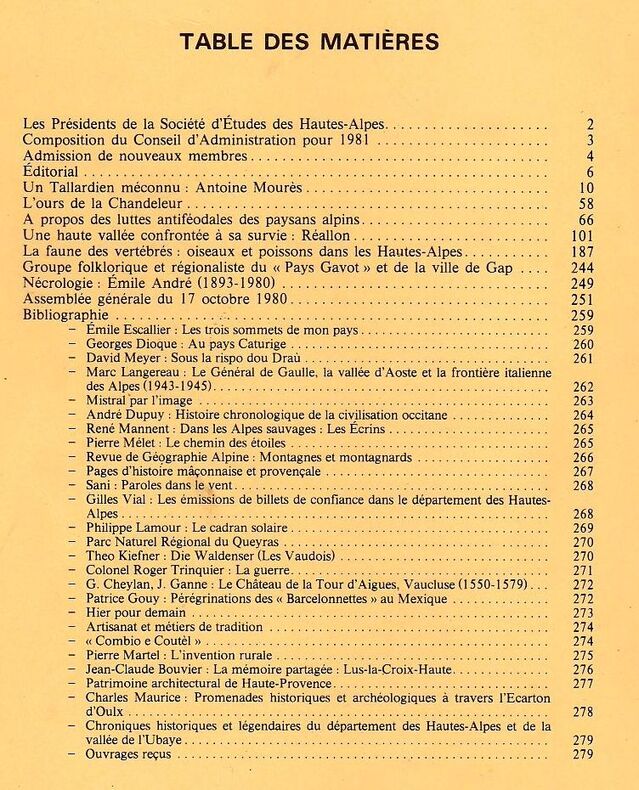 Au sommaire, entre autres : Un Tallardien méconnu : Antoine Mourès ; L'ours de la Chandeleur ; A propos des luttes antiféodales des paysans alpins ; Une haute vallée confrontée à sa survie : Réallon ; La faune des vertébrés : oiseaux et poissons dans les Hautes-Alpes ; Groupe folklorique et régionaliste du Pays Gavot et de la ville de Gap