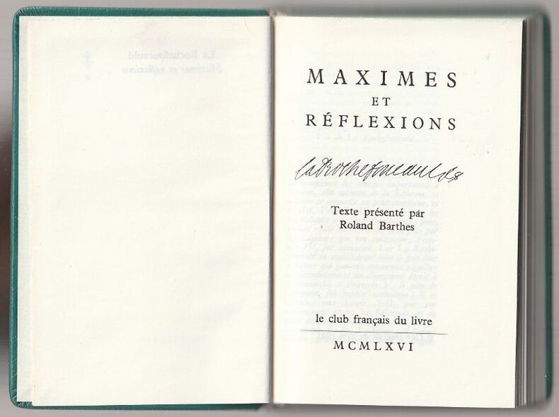 Nouvelle édition des Maximes de La Rochefoucauld avec les annotations de Amelot de la Houssaye. L'édition d'Amelot avait été publiée pour la première fois en 1714. Cette édition comprenait environ 200 maximes de plus que l'édition de 1693, mais celles-ci ne sont probablement pas de La Rochefoucauld. Le rédacteur de cette édition, R. Pichet établit dans son épître dédicatoire à M. de Fourcy qu'il a travaillé d'après un manuscrit de la bibliothèque de ce dernier. Les maximes, classées dans un nouvel ordre sont toutes suivies d'un commentaire d'Amelot de La Houssaye. Dans cette nouvelle édition de 1754, on a ajouté les Maximes chrétiennes de Madame de La Sablière. Le reste du volume est identique à l'édition de 1714. Quérard IV, 563 ; Marchand, n°38.