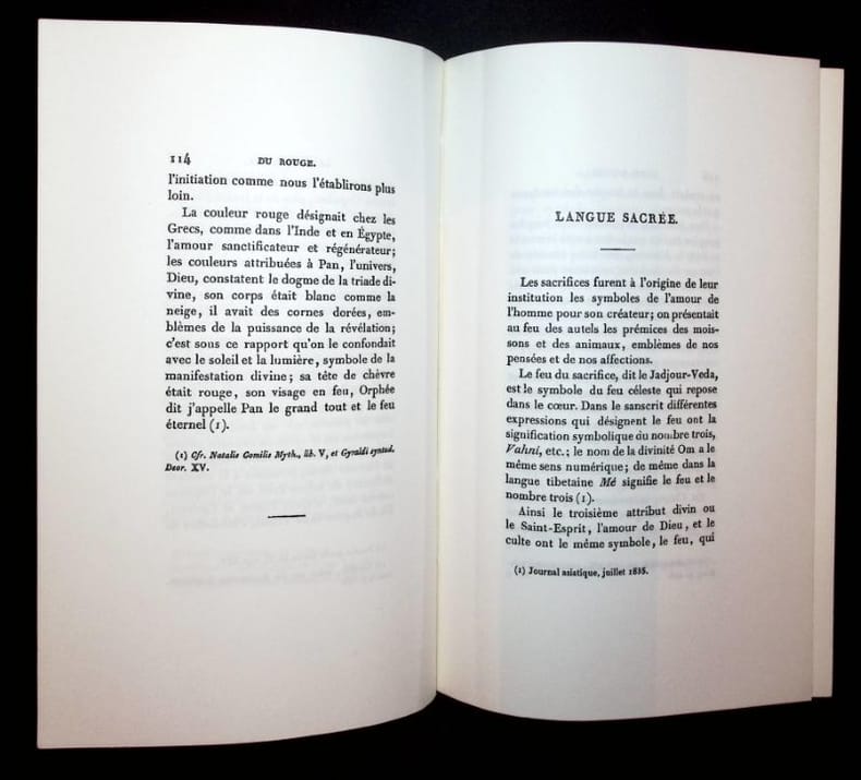 "Rare et précieux. Cet ouvrage est un de ceux qu'a dû connaître Eliphas Levi et qui lui ont servi à composer ses merveilleux travaux d'Exégèse Kabbalistique (St. de Guaita)." (Caillet, 8864) — "L'histoire des couleurs symboliques, encore ignorée, et dont je n'offre que quelques fragments, servira peut-être à déchiffrer les hiéroglyphes de l'Egypte, et à dévoiler une partie des mystères de l'Antiquité, je ne me flatte pas d'avoir atteint le but dans ces recherches ; ma seule ambition a été de fixer l'attention des savants sur le point le plus négligé et l'un des plus curieux de l'archéologie." Les couleurs eurent la même signification chez tous les peuples de la haute Antiquité ; cette conformité indique une commune origine qui se rattache au berceau de l'humanité, et trouve sa plus haute énergie dans la religion de la Perse ; le dualisme de la lumière et des ténèbres offre, en effet, les deux types des couleurs qui devinrent les symboles des deux principes bienfaisant et malfaisant. Les Anciens n'admettaient que deux couleurs primitives, le blanc et le noir, dont toutes les autres dérivaient ; de même les divinités du paganisme étaient des émanations du bon et du mauvais principe. "La langue des couleurs, intimement unie à la religion, passe dans l'Inde, en Chine, en Egypte, en Grèce, à Rome ; elle reparaît dans le Moyen Age, et les vitraux des cathédrales gothiques trouvent leur explication dans les livres zends, les Védas et les peintures des temples égyptiens." L'identité des symboles suppose l'identité des croyances primitives ; à mesure qu'une religion s'éloigne de son principe, se dégrade et se matérialise, elle oublie la signification des couleurs, et cette langue mystérieuse reparaît vivante avec la vérité religieuse. "Plus on s'élève vers l'origine des religions, et plus la vérité apparaît dépouillée de l'alliage impur des superstitions humaines ; elle brille du plus vif éclat dans l'Iran, patrie des premiers hommes."