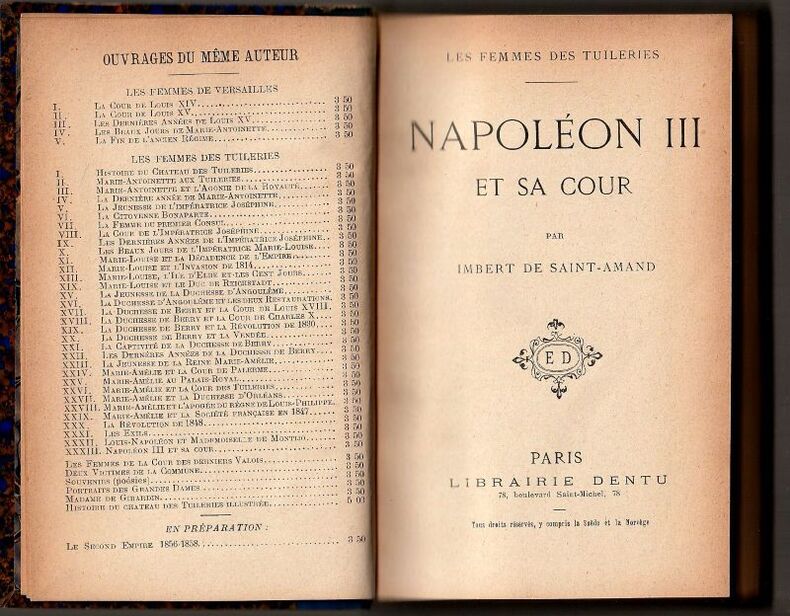 E. Dentu s.d. (1897) 521 p. "in-12 br., 33ème vol. de la série ""Les femmes des Tuileries"", dos abimé et recollé, intérieur propre, état moyen"