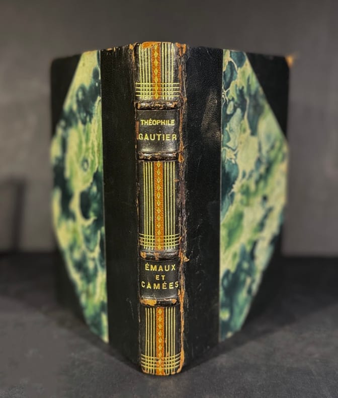 Paris, Poulet-Malassis et de Broise, Paris, Poulet-Malassis et de Broise1858 ; in-12, demi-maroquin outremer, coins, nerfs, fleurons dorés, tête dorée. (Reliure de l’époque) Frontispice, titre en rouge et noir, 230 pp., 1 f. avec le caducée.Edition tirée à 1000 exemplaires, 5 sur vergé plus quelques rares exemplaires sur vélin fort.C’est la troisième édition du recueil, les deux premières ayant paru chez Didier en 1852 et 1853. L’édition Malassis, en PARTIE ORIGINALE contient 27 poèmes, soit 9 de plus que la première de 1852, sans reprendre les 2 inédits de 1853. Les pièces nouvelles sont : Odelette anacréontique, Fumée, Apollonie, L’Aveugle, Lied, Fantaisies d’hiver, la Source, l’Art, Buchers et Tombeaux.Le frontispice dessiné et gravé à l’eau-forte par Emile THEROND (né à Saint-Jean du Gard en 1821) présente Gautier dans un médaillon avec un large encadrement d’orfèvrerie. Au sujet de ce portrait, voir Boucher. Icon. de Th. Gautier n°65: “La délicatesse que l’artiste a su mettre dans la composition de ce frontispice mérite éloge, c’est bien de ce genre un des plus heureux portraits de Gautier qu’on ait représenté, plein de finesse, de vérité et charmant à la fois. Pour symboliser l’oeuvre, Thérond a imaginé un cadre formé d’arabesques... dans lesquelles sont serties des pierres précieuses étincelantes et où viennent s’encastrer des émaux d’un ton doux, l’un égyptien, l’autre assyrien... L’artiste a dû s’inspirer pour le portrait d’une des photographies de Nadar...”Thérond est également l’auteur des nombreux bandeaux, fleurons et culs-de-lampe gravés sur bois dans le volume.Launay 64 - qui cite une lettre de Gautier à E. Feydeau publiée dans les Souvenirs intimes de ce dernier en 1874 : “Cet “étourdi de Poulet-Malassis (pullus gallinceus male sedens) a copié pour Emaux et Camées la première édition, de façon qu’il a sauté deux pièces qui sont ajoutées à la seconde : les Accroche-coeurs et les Néréides. C’est adroit pour un recueil complet! Il n’a pas mis non plus la pièce intitulée l’Art à la place indiquée : elle devrait venir après Bûchers et Tombeaux et clore le volume dont elle résume l’idée. Sauf cela, c’est parfait!” Th. Gautier était en Russie lorsque Malassis imprima ce livre, il ne put donc en surveiller la correction...Lonvenjoul II 147-48 (qui donne des lettres de Gautier à Malassis au sujet de ce volume) - Clouzot 72: “le volume est tiré sur excellent papier vélin légèrement azuré ou crème” - Vicaire III 910 - Tourneux. Gautier 8 - Jouanne 110.En 1863 le libraire Pincebourde écoula les derniers exemplaires de l’édition avec un nouveau titre à son nom.Bel exemplaire bien relié.GAUTIER (Pierre-Jules-Théophile).Le « poète impeccable » auquel Baudelaire dédia les Fleurs du Mal, fut un des auteurs de premier rayon de Poulet-Malassis. L’éditeur, hélas, ne fit pas fortune avec les livres de Gautier qui se vendaient mal. Mais le portrait du poète d’Emaux et Camées figurait en bonne place dans la luxueuse librairie du passage Mirès, parmi les médaillons peints des « auteurs-maisons ». Gautier et Malassis ne furent sans doute jamais intimes, car sans idées politiques précises, Gautier s’était peut-être un peu trop facilement adapté au Second Empire. Il faisait figure de personnage officiel, surtout dans l’entourage de la princesse Mathilde, qui le nomma son bibliothécaire en 1868. Poulet-Malassis, exilé alors à Bruxelles, n’a jamais fréquenté le salon de la cousine de Napoléon III, ces deux Bonaparte que liaient un attachement et un dévouement inaltérables. Gautier est mort en 1872, six ans avant Malassis.