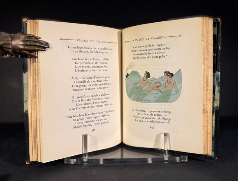 Titre : Émaux et Camées Auteur : Gautier Théophile Illustrateur : Wighead Éditeur : Éditions Nilsson Lieu d'édition : Paris Adresse de l'éditeur : 144, Avenue des Champs-Élysées, Paris Date d'édition : s.d. - vers 1925 Reliure : Quart de cuir brun - dos orné de filets et fers dorés, titre doré, caissons décorés - plats de papier marbré Format : petit in-12 - environ 16 x 11 cm Langue : français État du livre : bon état - frottements et petites usures au dos et aux mors, coins légèrement émoussés, intérieur propre avec un brunissement léger du papier et rares rousseurs Illustrations : page de titre en couleurs - nombreuses planches hors texte en couleurs d'après Wighead Description : Élégante édition illustrée d'Emaux et Camées de Théophile Gautier, publiée par les Éditions Nilsson. Page de titre polychrome et belles planches hors texte en couleurs signées Wighead. Reliure soignée en quart de cuir au dos richement orné, plats marbrés. Un charmant exemplaire de cette édition illustrée du grand recueil poétique.