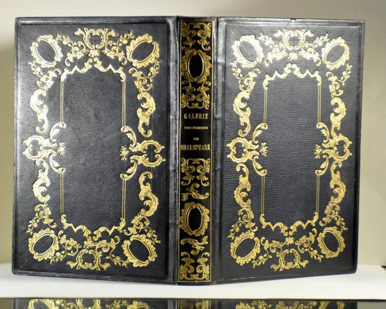 1 volume grand in-8 (25,4 x 16,6 cm), plein chagrin vert (reliure de l’époque signée Boutigny), dos lisse à riche décor, filets à froid encadrant les plats et une grande plaque décorative mêlant éléments décoratifs et feuillages, tranches dorées, [2]-xiv-180-[2] pages (complet). Infimes frottements angulaires, un coin un peu émoussé, très rares rousseurs. Très bon état. Édition illustrée d’un titre gravé et de 45 portraits hors texte pour autant de personnages. Ouvrage qui tient autant par la qualité de son illustration que par les plumes littéraires qui se prêtèrent à l’exercice : Pongerville, Chasles, Tastu, George Sand, Louise Swanton Belloc, Emile Deschamps, Delavigne, Bradi, O'Sullivan, Louise Colet, Coquerel, Resseguier, etc. Une autre façon, transversale de parcourir l’œuvre de Shakespeare. Bel exemplaire.