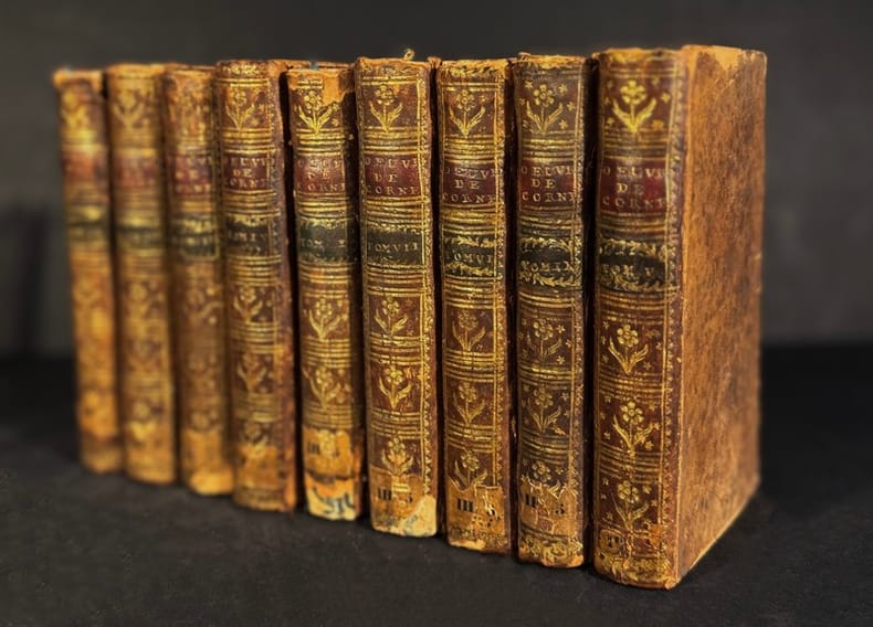 12 volumes in-8 (21 x 13,5 cm), veau raciné (reliure de l’époque), dos lisse orné, pièces de titre et de tomaison en maroquin vert, roulette dorée encadrant les plats et sur les coupes, tranches marbrées, [4]-476 ; 413-[3] ; 498 ; 548 ; 4-xi-[1]-5 à 503-[1] ; 543-[1] ; 578 ; 440 pages (complet). Infimes frottements aux coins, quelques rousseurs. État très correct. Nouvelle édition. Pierre Corneille (1606-1684) est un dramaturge et poète français du XVIIe siècle. Son œuvre, 32 pièces au total, est variée : à côté de comédies proches de l'esthétique baroque, pleines d'invention théâtrale, il a su donner une puissance émotionnelle et réflexive toute nouvelle à la tragédie moderne. L'ouvrage comprend ses œuvres théâtrales, comme Nicomède, le célèbre Cid ou encore des pièces comiques, comme La Suivante. Le tome XII comprend également les œuvres de son plus jeune frère, Thomas Corneille (1625-1709). Agréable exemplaire.