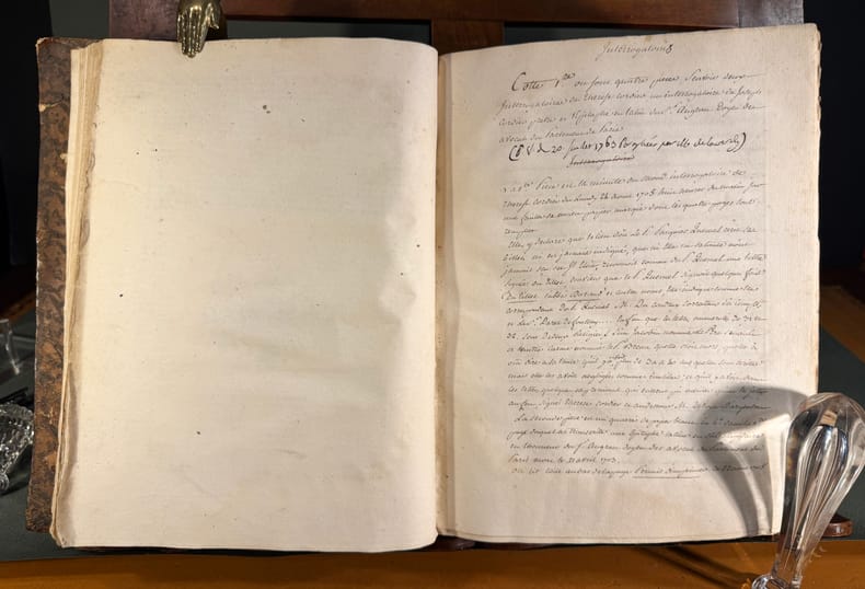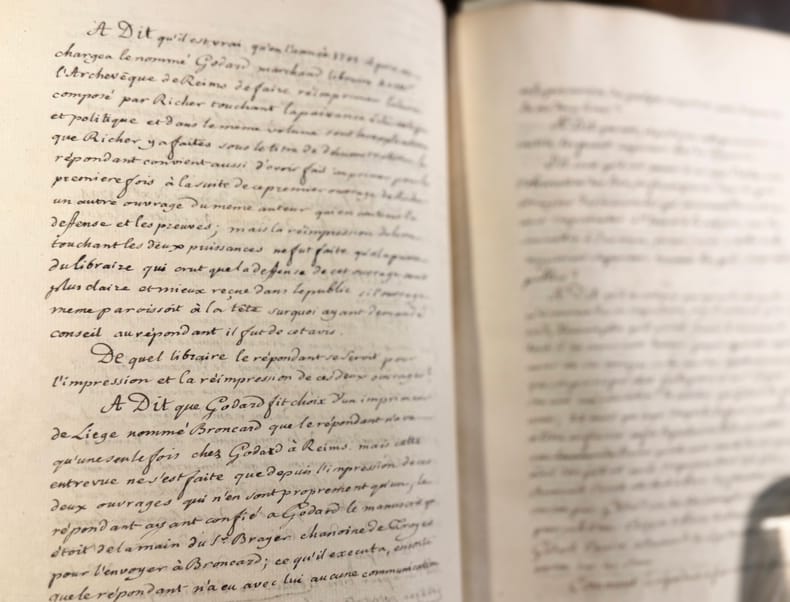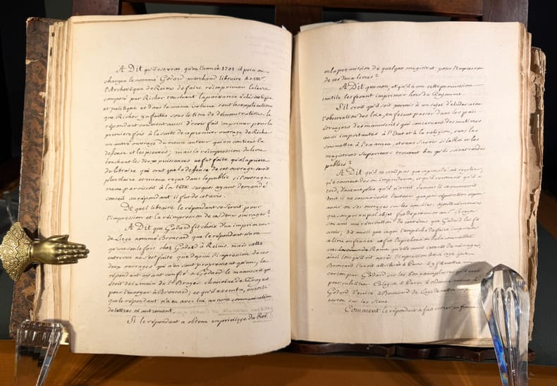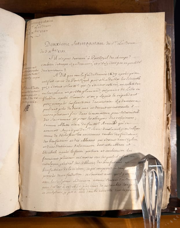 Le mélange débute par un compte-rendu imprimé de l'histoire de Blache et des pièces trouvées par le commissaire du Parlement au Collège Louis le Grand en 1763 (118 p.).Suivi de plusieurs centaines de pages manuscrites de l'époque (1704) d'interrogatoires faits dans la salle basse du château de la Bastille : confirmation de l'existence de réseaux, identités se dissimulant sous de nombreux pseudonymes, intentions secrètes de la cabale janséniste, etc.Seconde pièce imprimée : "Déposition juridique de l'abbé Blache pour rendre témoignage de deux miracles que le ciel a bien voulu faire en sa faveur par l'intercession du serviteur de Dieu Vincent de Paul, lorsque le déposant était détenu prisonnier injustement dans un cachot de la prison à Saint-Lazare-lès-Paris", 1706 (20 p.)Suivi à son tour d'une très volumineuse suite de descriptions de documents transcrits en tout ou partie, et d'une suite de mémoires, plaidoyers, contre-mémoires, etc., concernant la très enchevêtrée Affaire Blache.L'ensemble s'achève par une copie (brouillon ?) d'une lettre de l'abbé Blache à Madame de Maintenon contre le Père Lachaise : "en luy envoyant un placet au Roy, contre le Père La Chaise, confesseur de sa majesté qui doit faire bannir les jésuites hors du Royaume pour la seconde et dernière fois pour le mesme fait qui les fit bannir par arrest du Parlement de Paris du 29 décembre 1594. En date du 18 mars 1709."Le Père Blache était persuadé qu'un complot visait à empoisonner le roi Louis XIV.Fascinant ensemble de pièces concernant la lutte sans merci opposant les courants janséniste et jésuitique à la fin du XVIIe siècle.