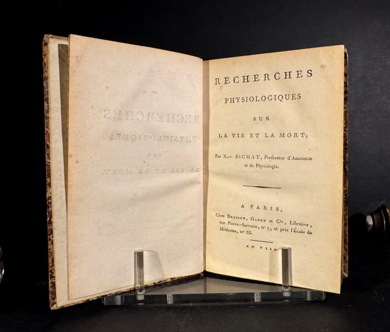 Comment définir la vie? Bichat répond dans son article premier "La vie est l'ensemble des fonctions qui résistent à la mort." La recherche de Bichat sur cette dualité et sur la mort des différents organes ouvre un nouvel espace de réflexion. - Garrisson n ° 597 --- ref en français dans le texte n° 204