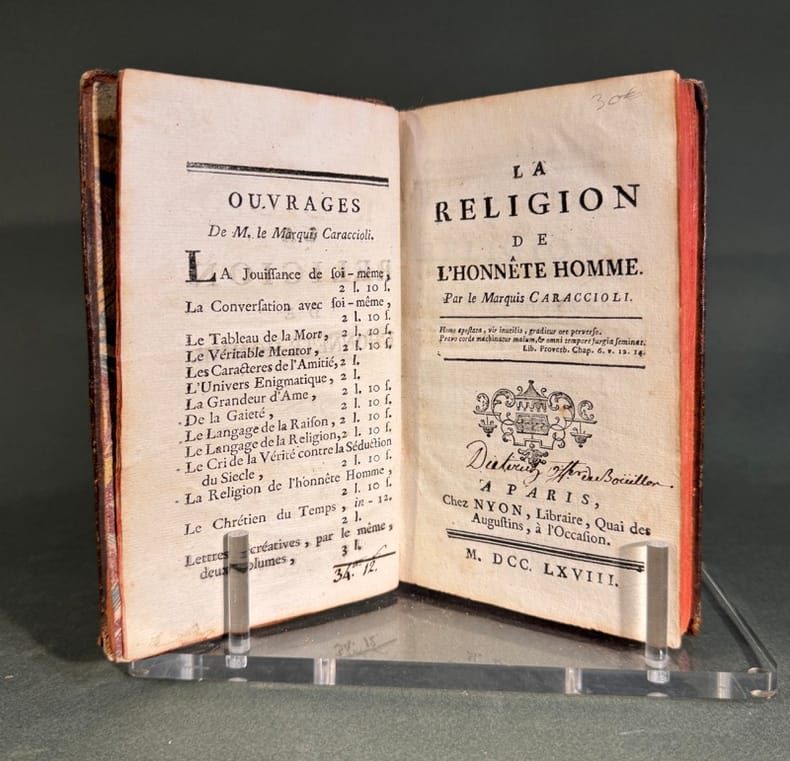 Edition originale d'un abrégé de doctrine chrétienne dans le contexte du triomphe des Lumières. Fécond homme de lettres, oratorien, Caraccioli est le fameux auteur du «Livre à la mode». Hoefer NBG VIII/653; Quérard, La France littéraire II/48. Quérard II, 48. Image disp.