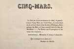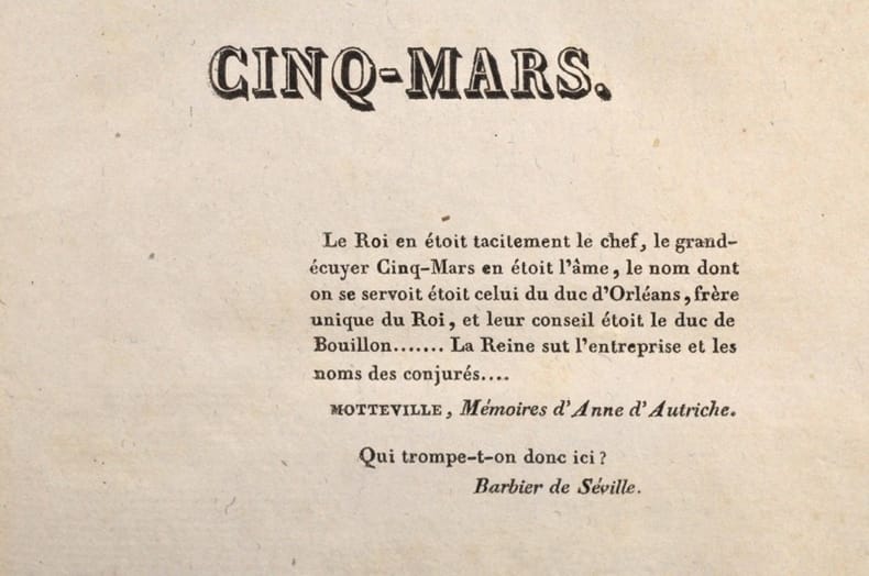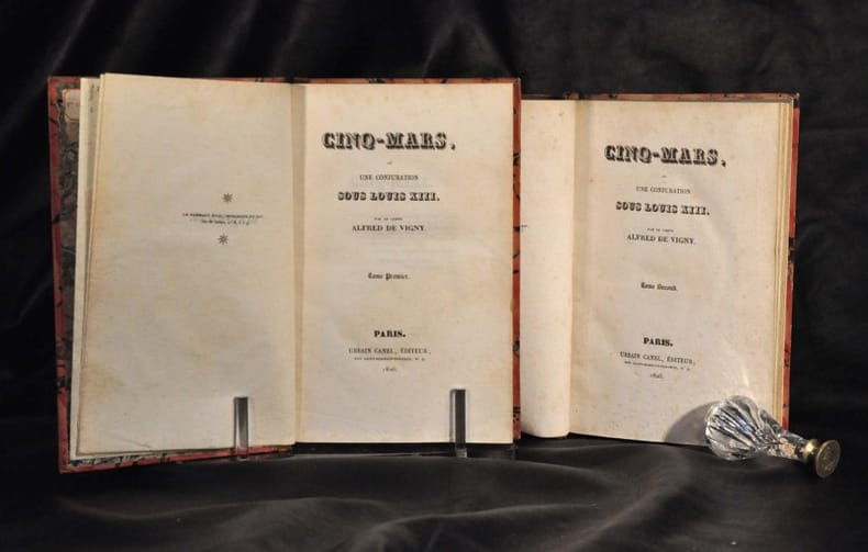 Rare édition originale de ce livre qui a fait connaître Alfred de Vigny et qui est considéré comme le premier roman historique français. Il cristallise le rapport problématique entre histoire et fiction, et de la vraisemblance narrative. Dans la troisième édition du Cinq-mars il développe sa théorie dans une préface intitulée « Réflexions sur la vérité dans l'art ». Il répond aux critiques qui lui reprochent ses écarts d'imagination et de poésie, il affirme que la liberté qu'il prend avec l'histoire est «la liberté que les Anciens portaient dans l'histoire même ».