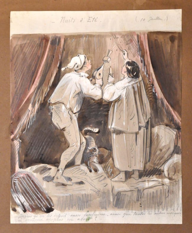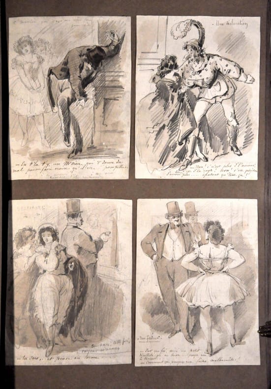Ces uvres originales regroupent toutes les périodes de l activité d Alfred Grévin de ses débuts, dans les années 1850 au Charivari, jusqu à la création du musée portant son nom, dans les années 1880. Certains des dessins pleine page sont à système et comportent des papiers collés proposant plusieurs versions. Plusieurs dessins portent des légendes autographes et font partie des productions les plus savoureuses de l illustrateur. Les scènes de genre, à l aquarelle ou au sépia sont particulièrement choisies et piquantes et illustrent spirituellement les thèmes propres à la vie parisienne au siècle d Offenbach. Le tout est d un comique joyeux, à l image de ce pêcheur à la ligne voyant surgir dans son dos un taureau furieux ou bien un dessin intitulé « Nuit d été » montrant un couple armé d un soufflet sensé détruire les moustiques qui les assaillent. Les scènes de beuverie, de rouerie féminine, succèdent aux visions de pochards lamentables, de bourgeois ébahis au salon de peinture, et aux parties de campagnes ratées. La majorité des scènes portent des titres et annotations. De l ensemble se détache une série d une quinzaine de compositions sur le thème des « grisettes » ou « partageuses » des plus représentatives du Paris canaille du second empire. Deux grandes compositions en couleurs portant le timbre humide de la vente Grévin dépeignent un tour de magie probablement du fameux cabinet fantastique de son musée : une tête coupée sur un billot parle au public alors que plusieurs autres têtes sont au sol. Une vue de coupe montre le subterfuge, l illusionniste est dissimulé derrière une fausse cloison. En fin d album plusieurs dizaines de dessins, charges caricatures, vivement troussés complètent l ensemble.