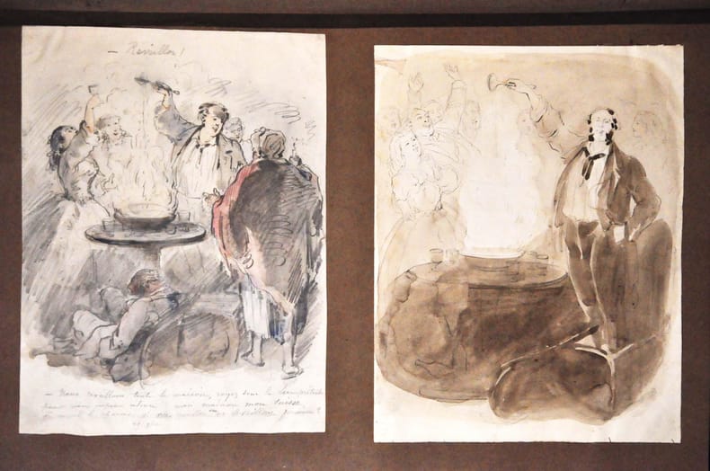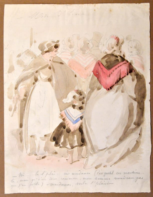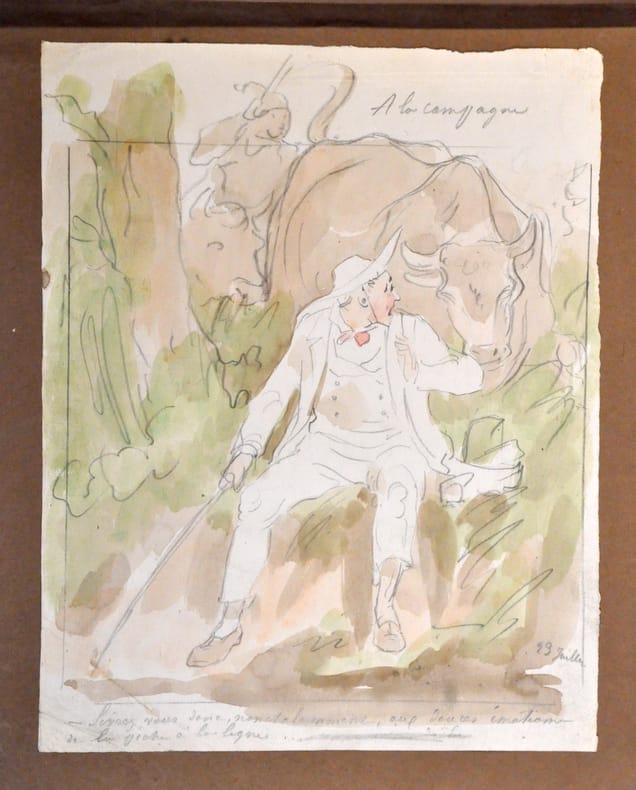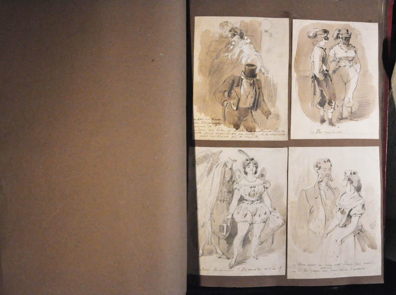1880 Une grande caricature hors texte rempliée ; 72 aquarelles annotées ; 59 dessins au crayon et 1 à la plume. Grand in plano (420 x 280 mm) en demi basane rouge, dos à six nerfs orné, titre en or. Les aquarelles et dessins originaux annotés sont montés sur papier brun tabac : collés au recto de chaque feuille selon leur taille essentiellement par groupes de 2 ou 4 , et quelques grands dessins. ___