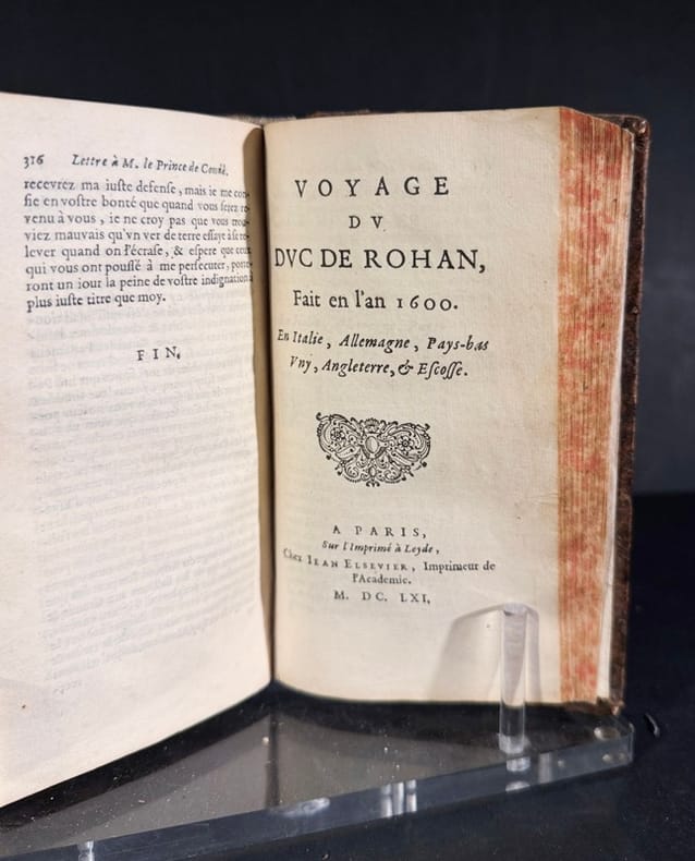 Bonne édition, la seconde augmentée, bien complète des 3 parties, chacune sous page de titre distincte, imprimée par Louis Elzevier à Amsterdam. "Huguenot de plume et d'épée", prince de la famille de Rohan, l'une des grandes familles princières bretonnes, Henri de Rohan (1579-1638) devint Colonel général des Suisses, chef du parti protestant sous Louis XIII, puis le héraut des libertés de la communauté réformée et le chef de la résistance protestante lors des guerres qu'il mena contre les armées royales avant de s'exiler. Par la paix d'Alais (27 juin 1629), il obtint le rétablissement de l'édit de Nantes, la restitution des temples aux réformés et, pour lui-même une indemnité de 300 000 livres, qu'il distribua presque entièrement à ceux de son parti. Ces mémoires constituent une source de première importance sur l'histoire politique et militaire de la France sous Louis XIII. Sur "L'importance du rôle joué par l'auteur dans le premier quart du XVIIe siècle devrait faire attribuer à ces Mémoires une grande valeur", cf. 'Sources de l'Histoire de France', n° 706, p.42. (Copinger, 'Elzevier Press', 3940. Rahir, 1046. Willems, 1044: "édition estimée...")....RARETE..en bon état (good condition).