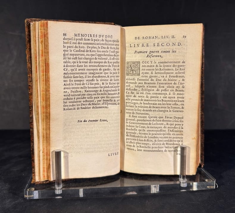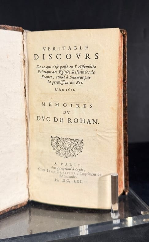 Edition en partie originale. Ce volume comprend les quatre livres des mémoires du duc de Rohan, chef du parti calviniste à l'époque de Louis XIII. Ils sont d'une importance capitale pour l'histoire politique et militaire de cette époque. On trouve à la suite divers discours politiques du même auteur. Bel exemplaire bien complet de ses trois parties. Willems, 1044; Lelong, 21579; Rahir, 1045; Pieters, 318, n°9.