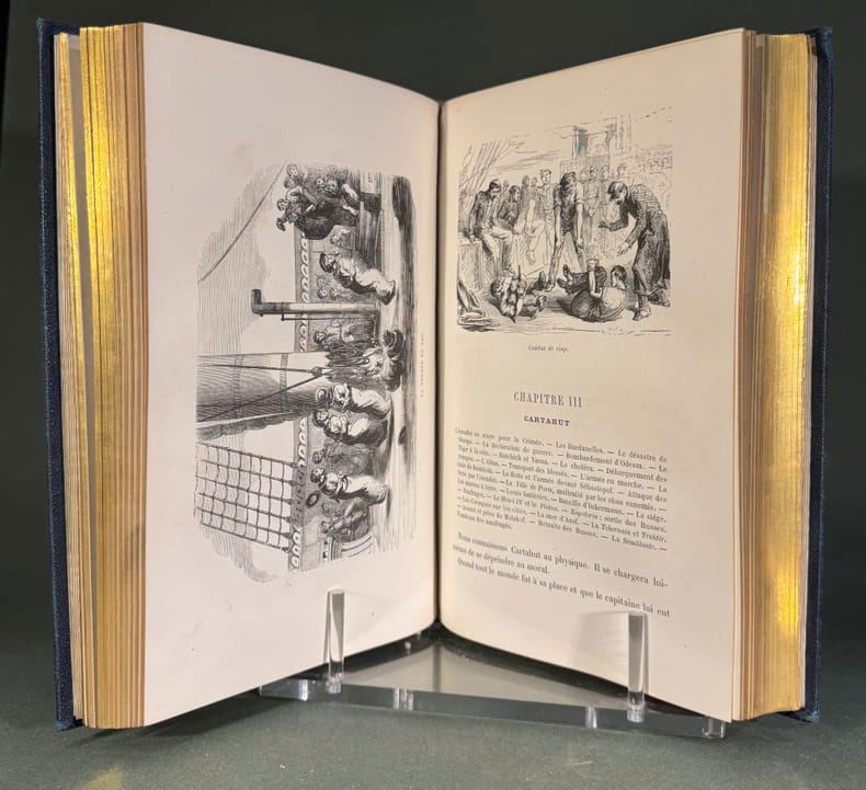 Paris, Théodore Lefévre, éditeur, 1862 1862 (2), 400ppGrand in 8 en demi chagrin bleu marine, dos à quatre nerfs, caissons orné de listels dorés, tranches dorées. Illustré de bois gravés in et hors texte. Exceptionnel état de fraîcheur de ce livre d’aventures maritimes dont le dernier tiers est une dénonciation du trafic d’esclaves qui relate la révolte d’un bateau négrier. Rare dans cet état.
