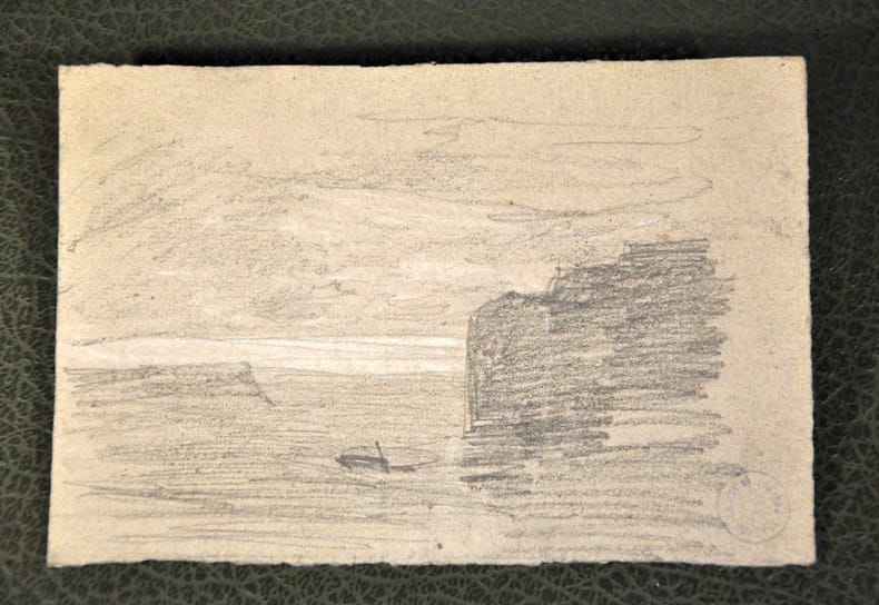 circa 1860 Dessin original annoté,Tampon de la collection Louveau (LUGT 1694A)15 x 10,5 cm Intéressante esquisses par Eugène Boudin (1824-1898) représentant des paysages de bords de mer avec falaises, probablement Honfleur.