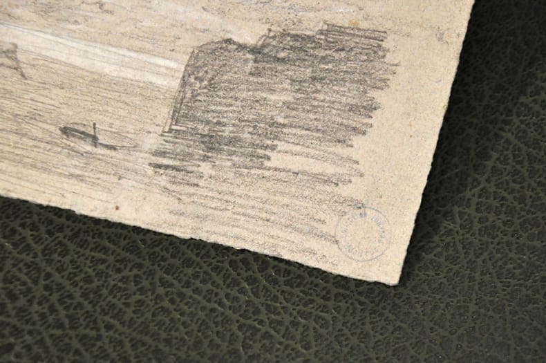Circa 1860 Dessin original annoté. Tampon de la collection Louveau (LUGT 1694A)14 x 9 cm Intéressante esquisse par Eugène Boudin (1824-1898) représentant un paysage de bords de mer avec falaises, probablement Honfleur.