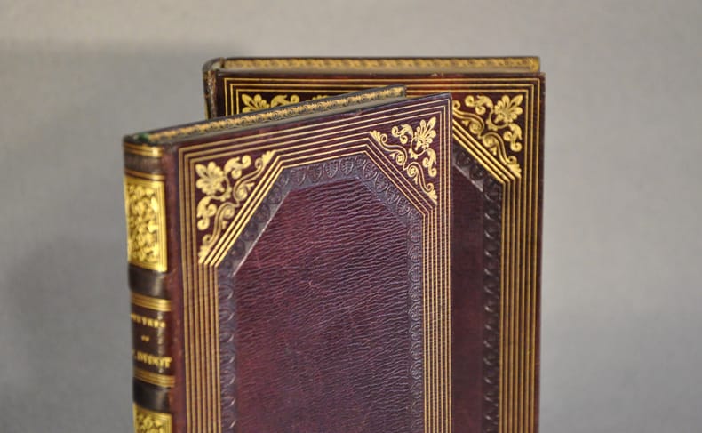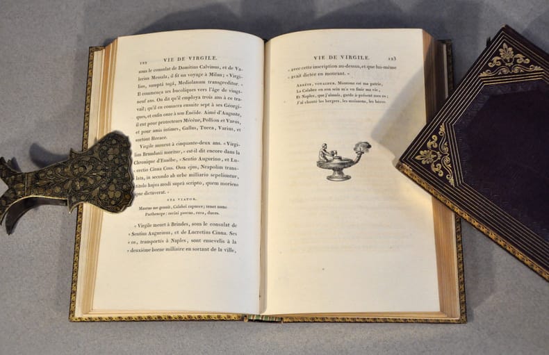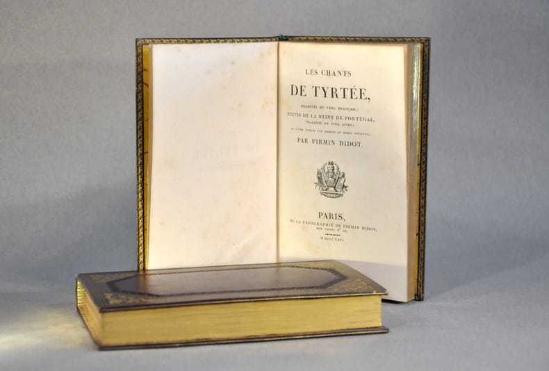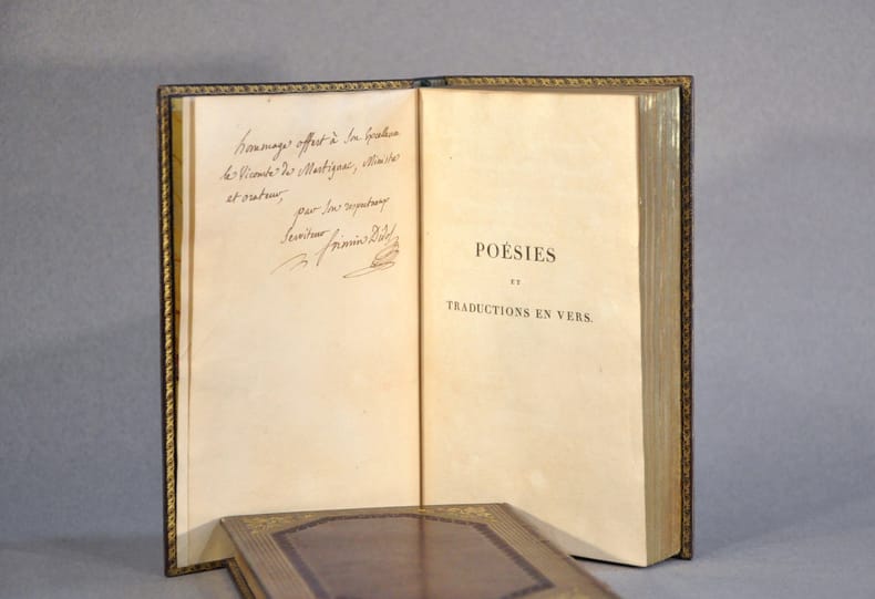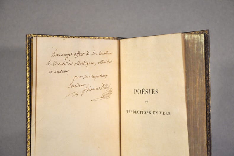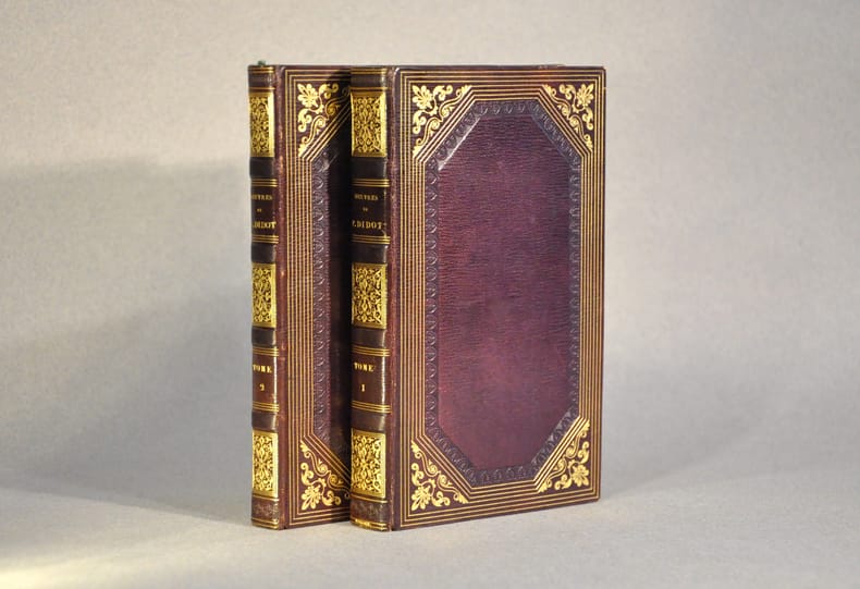 Paris, de la typographie de l’auteur, 1822 (Tome premier) ; Paris, de la typographie de Firmin Didot, 1826 (Tome Second) Faux titre, titre, 397pp ; faux titre, titre 227pp, Deux volumes in12 en plein maroquin aubergine à longs grains, dos plat orné de quatre faux nerfs et de fleurons dorés, titres et tomaisons frappés à l’or, signature Purgold en queue du tome premier. Plats ornés d’une dentelle au petit fer et de sept filets dorés encadrant quatre fleurons d’angles délimitant un octogone rectangulaire décoré en à froid, tranches dorées, dentelles intérieurs. Exemplaires imprimés sur vélin filigrané Didot père et fils. Envoie autographe de l’auteur « Hommage offert à son excellence le Vicomte de Martignac Ministre et orateur. Par son respectueux serviteur, Firmin Didot » Un petit « 2 » Manuscrit au crayon noté en fin de volume de chaque tome suggère un tirage de tête restreint.