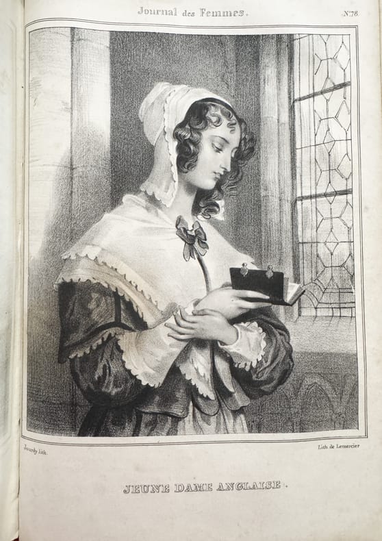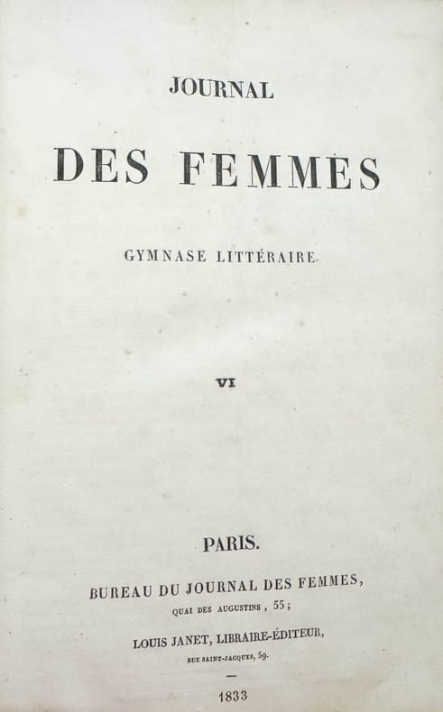 Paris, Bureau du Journal de Femmes, quai des Augustins, Louis Janet, Libraire éditeur, rue Saint Jacques, 1833 10 août 1833 – 2 novembre 1833 266pp dont 11 gravures, dont une aquarellées Le premier journal entièrement rédigé et conçu par des femmes pour un public féminin. Ce grand ancêtre de la presse féminine, est illustré de gravures réalisées par des femmes, (eaux-fortes et lithographies), de gravures de mode ou de genre, mais aussi de textes à coloration plus revendicatives : plaidoyer contre la peine de mort, contre l’esclavage, pour le divorce, sur la condition des femmes etc. Parmi les rédactrices, on relève les noms d'Aurore Dupin en 1833, devenue George Sand en 1835. Des poésies nombreuses d'Anaïs Ségalas, Mme Rolland, des comptes-rendus de lectures, rendent compte des nouveautés littéraires de Balzac, Théophile Gauthier.