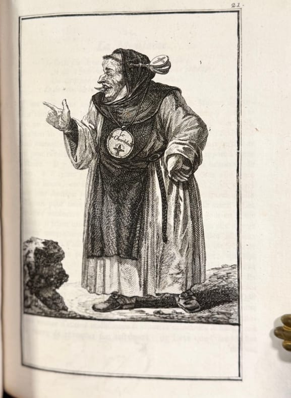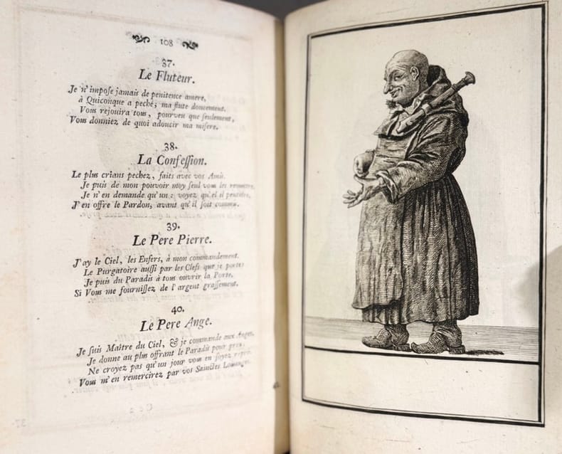 Bel exemplaire de cette très violente satire du monde monacale et de l’ordre des jésuites. L’ouvrage repose sur une suite de caricatures figurant la dépravation des mœurs des religieux, leur avidité, leur luxure et leur violence. Cette Édition clandestine est une variante de la première émission publiée vers 1700, reprenant les mêmes caricatures mais au lieu de les traiter en médaillon et de se fixer sur les trognes des moines et religieuses formant une galerie de portraits grotesques, le graveur les représente en pied dans un encadrement à double filet, ici imprimé avant la lettre. Comme le précise l’université de Prinston cette édition pirate et clandestine, a probablement été éditée en suisse et constitue la première réédition de ce très violent pamphlet depuis 100 ans. Le choix de cette nouvelle mise en scène, plus théâtrale et moins accès sur les faciès a permis au dessinateur de représenter d’éloquentes mises en action : - Une religieuse frappe un mendiant - Un inquisiteur brandit un crucifix alors qu’il est entouré de diables - Pour l’estampe nommée « la confession » un confesseur libidineux agrippe une religieuse de façon explicite Le baroque des mises en scène s’oppose ainsi aux titres lapidaires « l’insatiable, le délicat, le frustre ».Les planches ont été attribuées à Cornelis Dusart (1660-1704) ou copiées sur lui, bien que le frontispice de ce volume soit gravé d'après Romeyn de Hooghe (1645-1708).Rare et spectaculaire. (Brunet IV, 1238 ; Cohen 870 ne distingue qu'une édition).