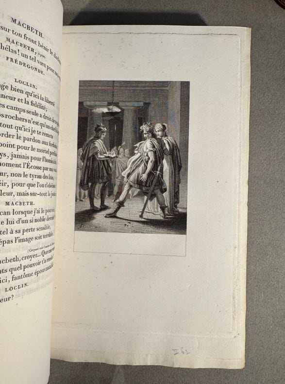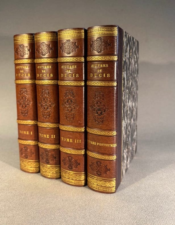 Paris chez A. NEPVEU, Libraire, 1826 4 volumes in-8 ( 225x135 mm ) demi maroquin à longs grains havane à coins, dos orné de fleurons en à froid en alternance de petits fers à l’or, pièce de titre et de tomaison frappé dans les deux entre-nerfs eux guirlandes dorés, tranche de tête dorée, signée Klein. Exemplaire sur grand papier réimposé, très large de marges. Contenu et collation.Eau forte pure, et Tome I. XII, 433 pages. Couverture rose conservée. Portrait de l’auteur gravé au frontispice, avant la lettre sur chine appliqué, eau forte pure et en tirage définitif. Portrait de Voltaire d’après de Latour gravé par Pourvoyeur, sur chine appliqué Portrait de Voltaire d’après de Frilay gravé par Soliman, avant la lettre Portrait de Voltaire devant le Château de Ferney par Desenne gravé par Bonvoisin sur chine et à l’eau forte pure. Avis du librairie. Avertissement. Discours. Hamlet. Epître . Variantes. Roméo et Juliette. oedipe chez Admète. Le Roi Léar. Epître. – Tome II. 471 pages. Macbeth. Avertissement de Jean sans Terre. Othello. Romance du Saule. Abufar. A Florian. Oedipe à Colone. Le Banquet de l'amitié.- Tome III. 506 pages.Epîtres. Poésies diverses. Lettres.- Tome IV. 423 pages.Notice sur la vie et les écrits de Ducis. Amélise. Feodor et Wladimir. Epîtres. Poésies diverses. Lettres. Oeuvres.