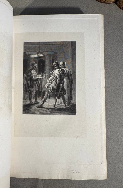 1819 Paris, Nepveu,1819 ; 3 volumes in-8 demi-basane blonde de l'époque, dos à nerfs plats, nerfs ornés de palettes dorées,entre-nerfs ornés de larges palettes dorées et fleurons à froid, titre et tomaison dorés,t ranches bleues jaspées de rose; 2ff., LXXXVIpp., 387pp., 1p.nch.; 2ff., 461pp., 1p.nch.; 2ff., 503pp. Illustré d'un portrait de Ducis par Gérard gravé par Fersell et de 11 gravures hors texte d'après Desenne et Girodet.