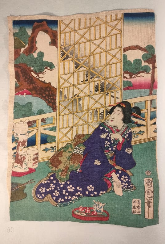1890 Estampes japonaises sur papier traditionnel Hô-shô, fin XIX°. En moyenne, 19x26cm, aux coloris vifs et chatoyants représentant des scènes de genre. Vues d extérieur, jardin, activités domestiques, geishas. Toutes d une qualité vraiment remarquable. Au choix, 80 pièce, 140 les deux.