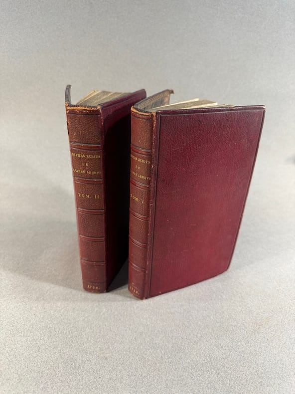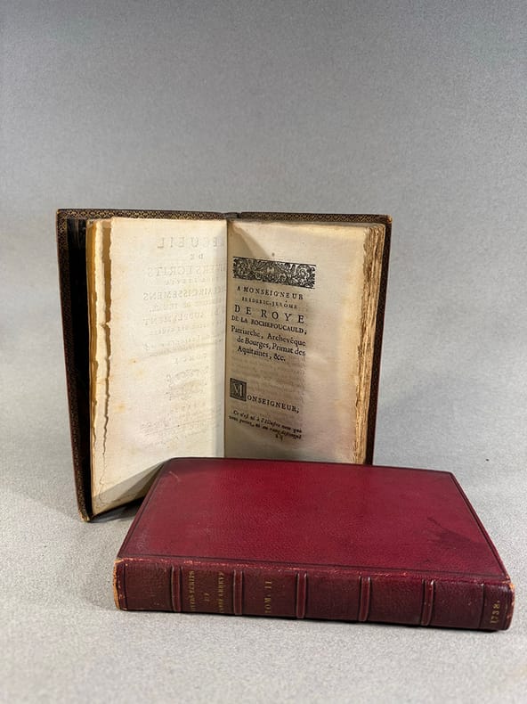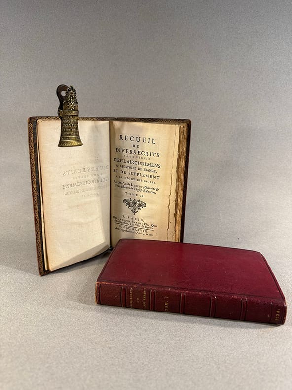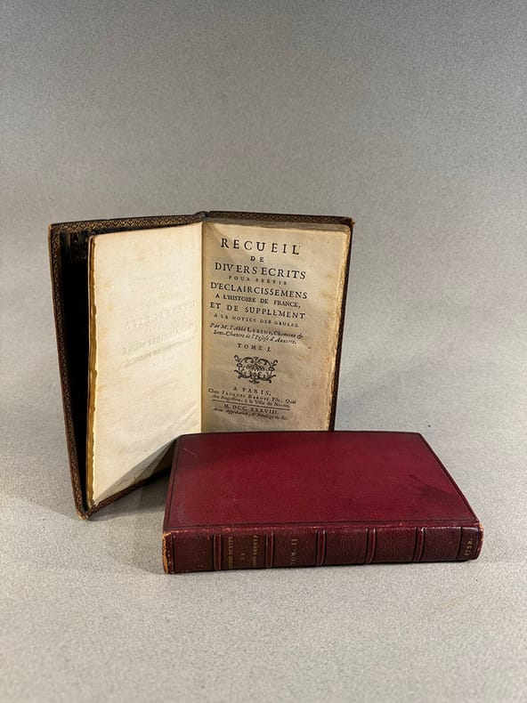 Nevers Jacques Barois 1738 A Paris, chez Jacques Barois fils, quai des Augustins, à la ville de Nevers. Avec approbation , & privilège du Roi. 1738. in-8, 9 feuillets, 416 pages, 5 feuillets pour le premier volume, 3 feuillets, 376 pages, 42 feuillets, tous deux maroquin rouge, reliure signée Closs, sur le dos cinq nerfs entre lesquels sont frappés à l’or le tire, la tomaison et daté en queue. Sur le second volume : de 3 cm sur le mors supérieur gauche et 4 cm inférieur gauche. Illustré d’une carte dépliante (carte géographique des lieux voisins d’Auxerre), de 2 gravures hors-texte représentant les figures gauloises et la représentation d’une statue également gauloise découverte par un laboureur dans une crypte ; 4 gravures pour le tome 2 représentant des haches et inscriptions découvertes lors de fouilles. Intéressante ensemble de publications et observations notamment sur des antiquités gauloises et romaines trouvées dans le diocèse d’Auxerre, au XVIII°.