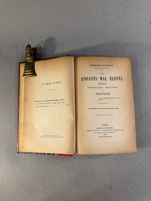 Paris Librairie Académique Perrin 1907 In-8, VII, 530 pages. Table des matières : « portrait d’enfants mal-élevés », « l’enfant mal élevé de trois ans », « l’enfant mal élevé de dix ans » « l’enfant mal élevé de quinze ans », « analyse du diction jeunesse se passe » ; « petit procédé d’éducation domestique : les comparaisons, les moqueries, les humiliations, le dressage, l’autorité et la correction ». « Le sentiment est-il préférable dans l’éducation ? », le fouet, punitions, le regard fuyant, analyse du rire, la schlague, etc.