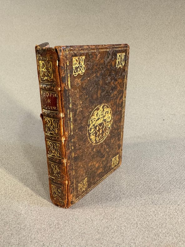 Amsterdam Jean Jansson 1668 Amsterdam, chez Jean Jansson à Waesberge et la Cefve de Feu Elizée Weyerstraet. L’An 1668. In-12 (4) blanc, gravure de titre : frontispice avec l’execution de Charles Ier et l’incendie de Londres, titre, 2 feuillets Avertissement au lecteur, gravure de Nostradamus, 3 feuillets La Vie de Maistre, 7 feuillets adressés à l’Invictissime , Tres-puissant, Et Tres-Chrestien Henry Second, Roy Second, Roy de France, 158 pages, (5) blanc. Livre rare, plaisant exemplaire. Reliure en veau granité, chiffres aux angles des plats, armoiries au centre de Hélie Dufresnoy 1614-1698, célèbre bibliophile du XVII°s. dont la bibliothèque choisie faisait plus de vingt mille volumes. Les exemplaires des prophéties de Nostradamus sont fort rares. Les douze centuries sont augmentées des présages et autres prédictions de Nostradamus « pour les ans courans en ce siècle »