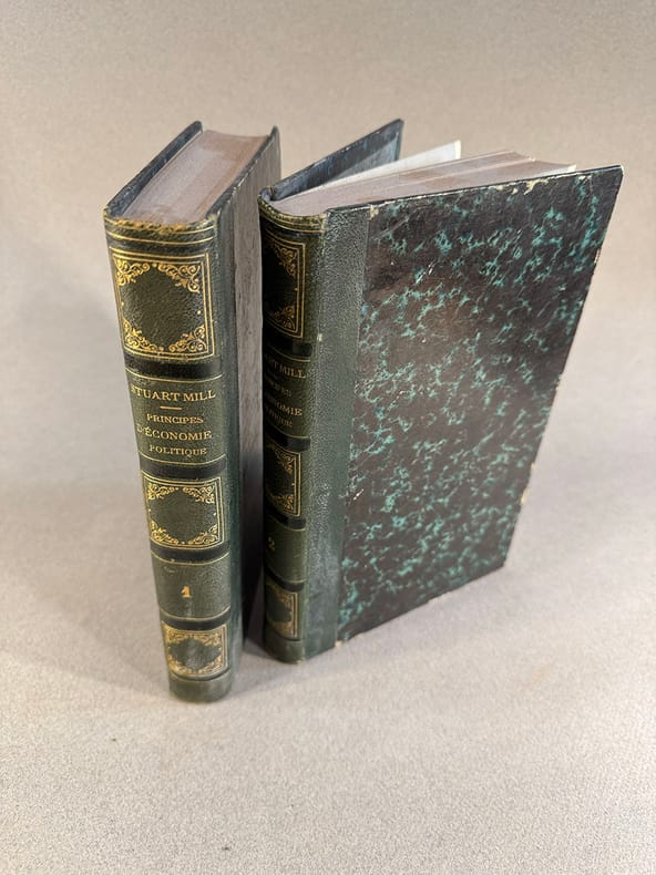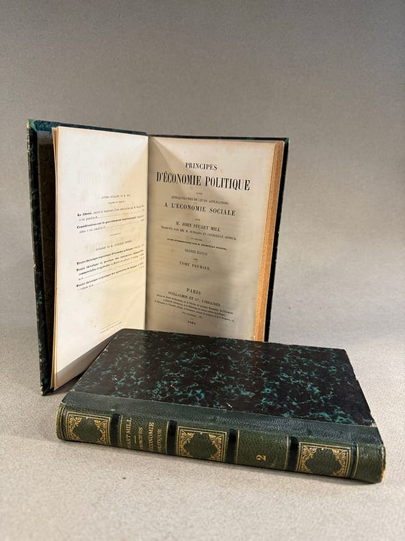 Paris Guillaumin et Cie, libraires In-8 : T1. (1) blanc, (5) non numérotés, pré-titre, titre, introduction jusqu’à XXVIII, 564 pages, (1) blanc. T2. (1) blanc, (1) pré-titre, (1) titre, 532 pages, (1) blanc. Demi chagrin vert empire dos orné de fleuronsSolide exemplaire en reliure contemporaine. Penseur libéral parmi les plus influents, Mill fut philosophe, logicien et économiste. Œuvre majeure d’économie politique, il y établit la théorie de l’avantage comparatif inspiré par Bentham et Ricardo en 1817.