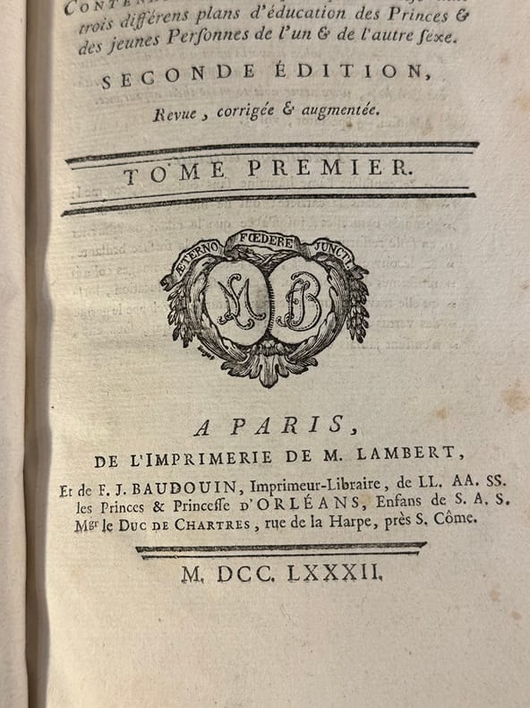 Paris De l'imprimerie de M. Lambert 1782 Seconde édition, Revue, corrigée & augmentée. Livre en deux volumes. In-8, (1) Faux titre, (1) titre, Préface 20 feuillets, 460 pages ; 430 pages ; 464 pages suivi de la Table (1), Privilège du Roi (1). Plein veau en vert empire moucheté, chainettes frappées d’or. Dos plats ornés, pièces de titre et de tomaison de maroquin rouge.L’édition originale de ce traité d’éducation conçu sous forme épistolaire par Madame de Genlis alors préceptrice des enfants des enfants du duc de Chartres. A la suite de la publication de L’Émile de Rousseau, en 1762, Madame de Genlis, rousseauiste elle-même s’emploie à écrire ce roman épistolaire, fruit, dit-elle de quinze ans de réflexion. Le traité est immédiatement un vif succès et fut mainte fois réédité jusqu’au XIX° siècle. La nécessité de donner accès à la connaissance, tant aux sciences qu’au monde des lettres, doit s’adressé tant aux filles qu’aux garçons. Il faut que les enfants aient une éducation précoce, pétrie de sentiments religieux et de morale, tout en restant ouverte sur le monde. Bel exemplaire en veau moucheté de l’époque.