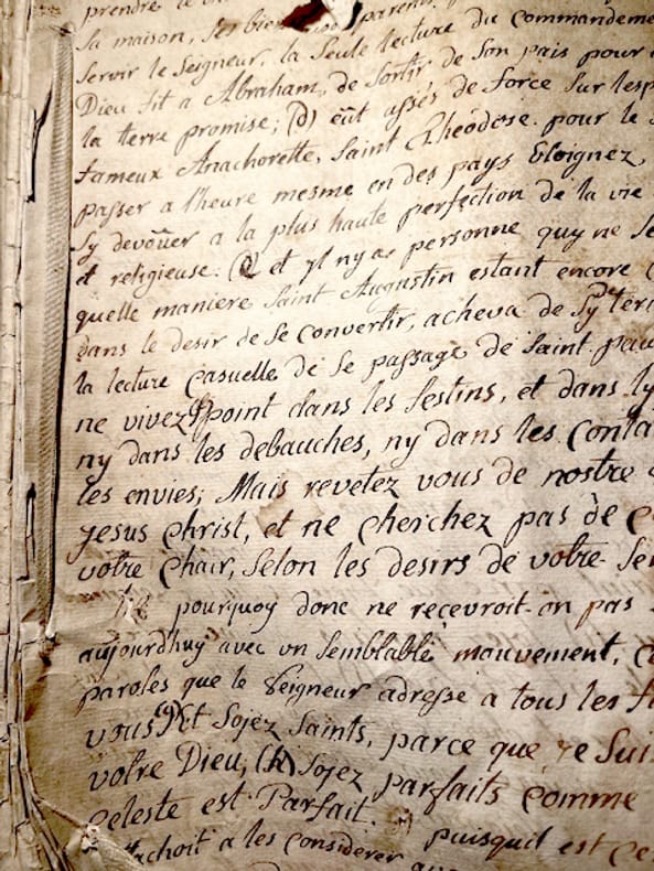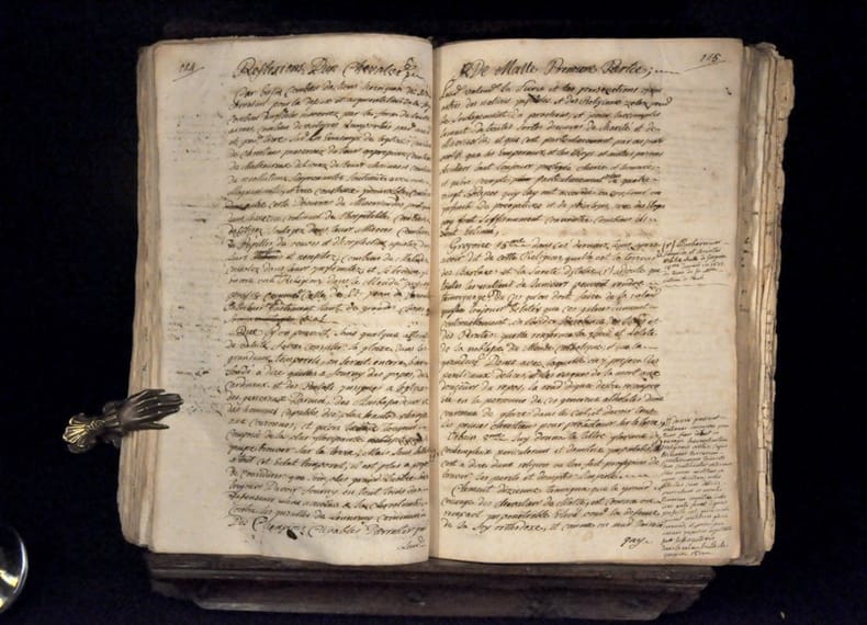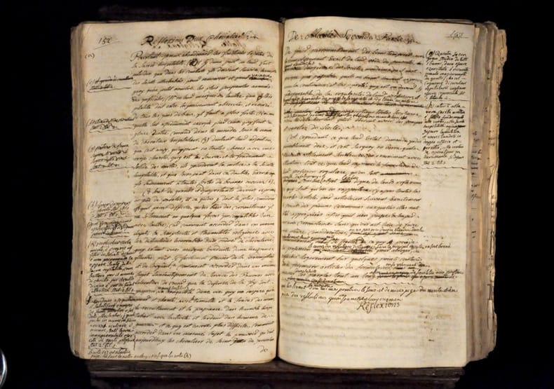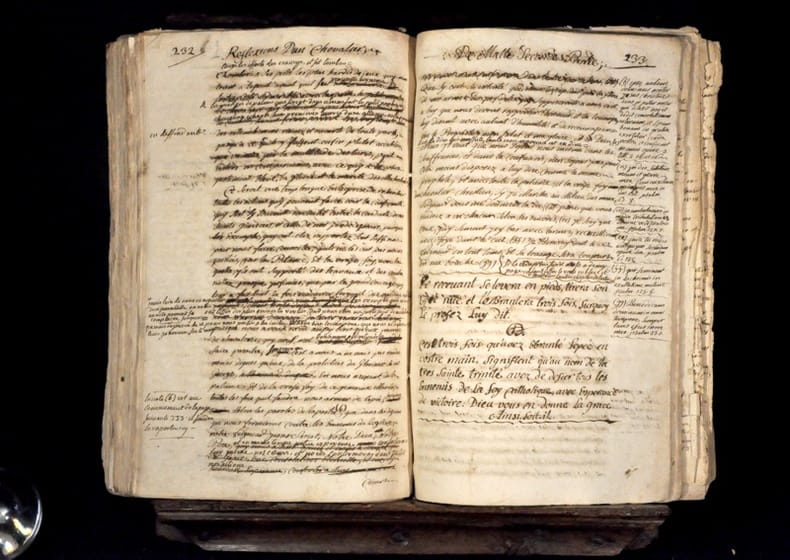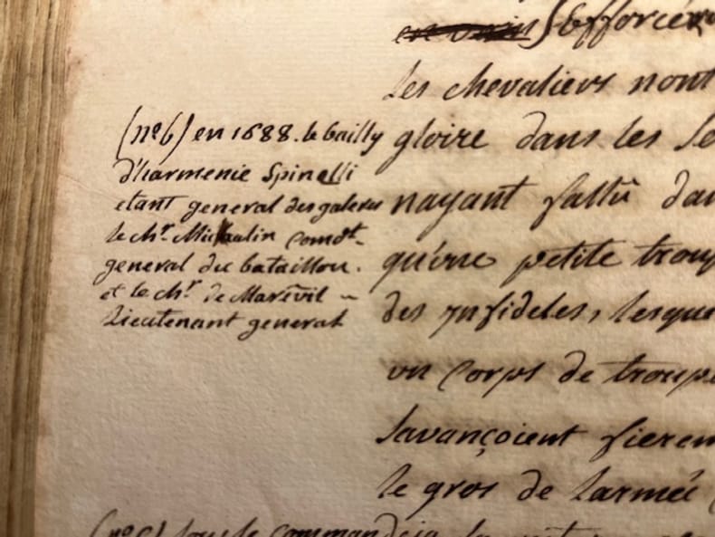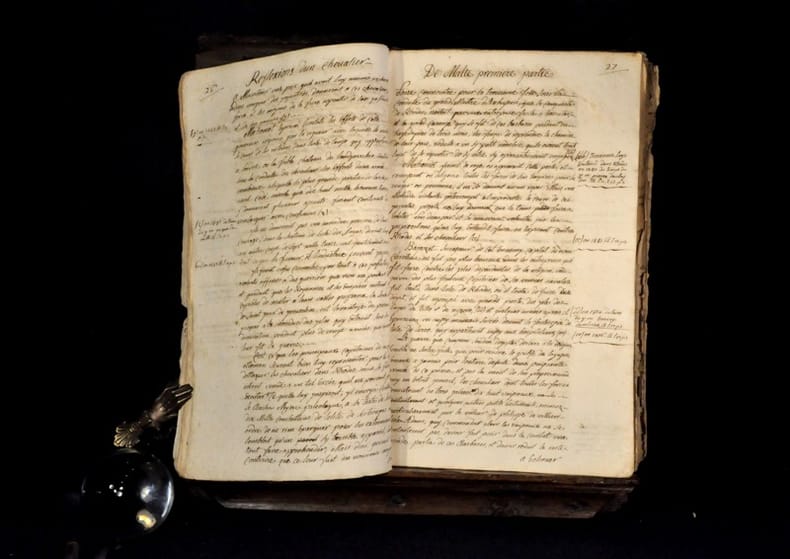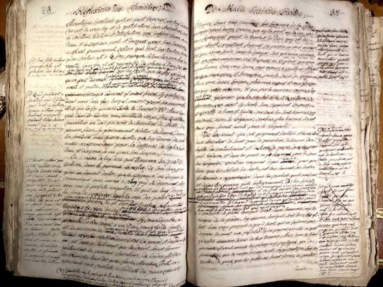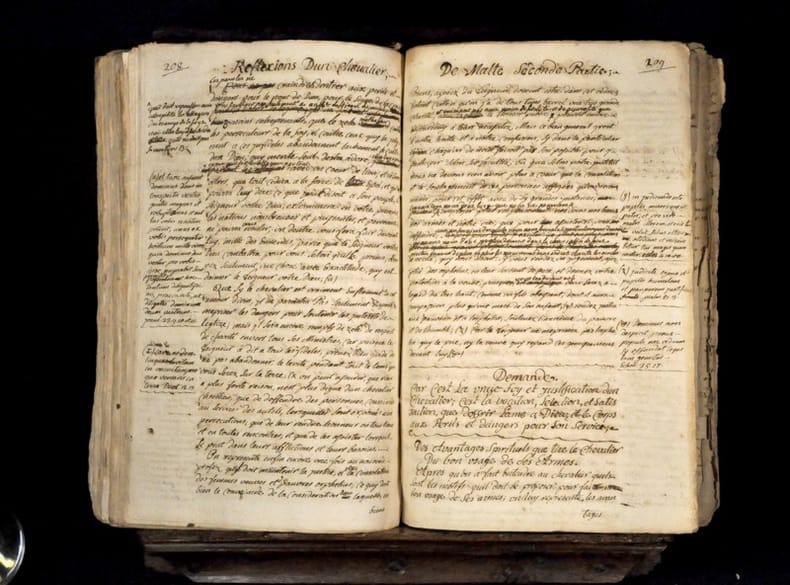 I – Historique de l’ordre de malte L’Ordre de chevalerie le plus ancien au monde : il fut créé en 1048. L’ordre dont le symbole est la croix blanche à huit pointes se donnera pour but la défense militaire des malades et des pèlerins lors des croisades. Sa double vocation militaire et hospitalière se verra confirmée au fil des siècles par la refonte en une seule entité des anciennes confréries de l’ordre des Templiers et des Antonins. Basé dans l’ile de Malte l’Ordre souverain militaire et hospitalier de Saint Jean de Jérusalem, de Rhodes et de Malte eut au cours des XVIe et XVIIe siècles un rôle essentiel dans la lutte contre les Turques.Parallèlement à cette activité guerrière l’institution prit en charge les malades et lépreux qui bénéficièrent de l’expérience acquise par l’ordre des Antonins. En lutte constante contre les galères turques, l’ordre devint une puissance incontournable du bassin méditerranéen. À la fin du XVIIe siècle, le relâchement des moeurs et un certain laissé aller rendirent nécessaire une nouvelle mise au point des droits et devoirs de l’ordre. II – Texte de Jean Baptiste le Marinier de CanyC’est ce qu’entreprend en 1688 le commandeur Jean Baptiste le Marinier de Cany dans un travail intitulé « Réflexions d’un chevalier de Malte, Religieux de l’Ordre militaire des Hospitaliers de Saint-Jean de Jérusalem sur la grandeur de son état ». Ce texte, encore inédit de nos jours connaît deux versions, une italienne, une française. Le chercheur Luigi Michele de Palma a publié un article en 2019 « Jean-Baptiste Le Marinier de Cany un maestro della spiritualita giovannita » Edizioni La Villa, une analyse de la structure de ce texte fondamental concernant non seulement l’éthique et l’histoire de l’ordre mais aussi sur le rituel de l’adoubement des chevaliers. Son travail s’appuit sur l’analyse d’un manuscrit conservé à la Bibliothèque de La Valette (Libr.1416), celui ci, comprenant cinq parties, au lieu de trois dans notre exemplaire. Notre manuscrit offre en comparaison d’intéressantes variantes. Ainsi, dans la seconde partie, chaque section est précédée des phrases prononcées par le chevalier lors de sa réception ainsi que la description minutieuse de chacun des moments clefs de la cérémonie. Ces instants forts, sont dans notre manuscrit l’occasion d’en expliquer la symbolique rejoignant en cela l’exemplaire décrit par Luigi Michele de Palma de la bibliothèque de Malte. Par exemple : folio 190, « le profes donne lespée au recevant avec son fourreau en la main lui disant. (un mot rayé) à cette fin que mainteniez tout ce que vous avez promis prenez cette espée au nom du Pere, du Fils, et du Saint esprit. Ainsisoitil. »___ Des sentiments que doit inspirer un Chevalier de la manière dont on lui présente lépée »L’intégralité du déroulé de la cérémonie est également reportée en début d’ouvrage sous un titre écrit en rouge (la forme de donner l’ordre de chevalerie (…) Cette section est apparemment absente de l’exemplaire décrit par Luigi Michele de Palma. Carmen Depasquale, responsable du département français de la faculté des arts de l’université de Malte, auteur d’une thèse de doctorat en 2000 intitulé « La vie intellectuelle et culturelle des chevaliers de Malte au XVIIIe siècle », donne une description des exemplaires connus de ce texte, tous inédits, deux textes en français NLM.libr 1416 ; NLM.libr 324) Ainsi que deux versions italiennes, l’un : NLM.libr250 est comme notre exemplaire est composé des deux premières parties, l’autre : NLM.libr558 comporte les parties 3 à 5 et la table des matières. III – Remarques sur la nature de ce document Les nombreux remords, biffures, réécritures de texte sont parfois d’une importance considérable. Ils indiquent que notre manuscrit est un exemplaire de premier jet ou du moins dans un stade d’élaboration d’un texte définitif, comprenant d’amples extensions marginales possiblement intégrées au texte dans une version ultérieure. Ceci laisse à penser que ce manuscrit est vraisemblablement autographe. Une date en marge de 1688 indique par ailleurs que la rédaction de celui-ci est antérieure avec la date généralement donnée de 1689 à la version conservée à la Bibliothèque de La Valette. Les remords, salissures, taches, lignes raturées et ajouts inter-textuels ne laissent aucun doutent la nature originale de ce manuscrit. Un manuscrit du plus vif intérêt probablement autographe de Jean Baptiste le Marinier, Chevalier de Cany, qui eut un impact majeur sur l’ordre militaire des chevaliers de Saint Jean de Jérusalem, dans lequel se trouve minutieusement décrit le déroulé de l’adoubement des membres de l’ordre.