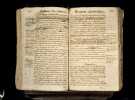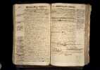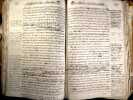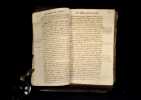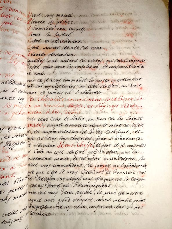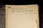 Circa 1688 Manuscrit composé de 15 cahiers assemblés par des lacets et reliés entre eux par une cordelette de lin (177 feuillets in-folio (230 x 355 mm). Calligraphie très lisible, écrite à l’encre noire et à l’encre rouge, réglé au crayon en marge. Quelques déchirures, manques dans les premiers feuillets. Manuscrit très fortement raturé et surchargé. Composition - Avant-propos, 6ff.- Suivi de : « Formulaire de la profession reguliere des Chevaliers de Malte » (à l’encre rouge) 1ff.- Suivi de : « Oraisons que le prestre dit avant la profession ». En latin aux encres rouges et noires, 2ff.- Suivi de : « La forme de Donner l’ordre de Chevalerie, Les oraisons finies, le prestre commence la messe et sarreste avant levangil alors celui quy se dispose a recevoir l’habit se leve de devant l’autel, et va se mettre a genoux devant le chevalier quy la luy doit donner : pour en recevoir premierement lordre de chevalerie lequel luy dit (…), 4ff.- Suivi de : « Troisieme section contenant les paroles qui se prononcent en faisant les vœux », 1page. - suivi de : « Quatrième section contenant la forme de donner la croix et l’habit régulier de l’ordre et les oraisons quiserecitent pour conclusion de la cérémonie » 2 ff.- Suivi de : « Oraison après profession » (à genoux devant l’autel), 3ff.- Suivi de : « Reflexions dun Chevalier de Malte Religieux de l’ordre militaire des hospitaliers de Saint [Jean] de jerusalem. Sur la grandeur et les devoirs de son Etat ». 326 pages numérotées, dont les 4 derniers blancs. Le dernier marqué au verso d’une autre écriture : « Recu Ch de Malthe dan langue de provence le premier 7 bre 1572. »Défauts : Saut de pagination entre la dernière page de table marquée 293 à la partie commençant par : « réflexion d’un chevalier » paginée 303.