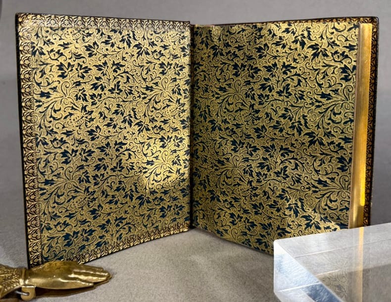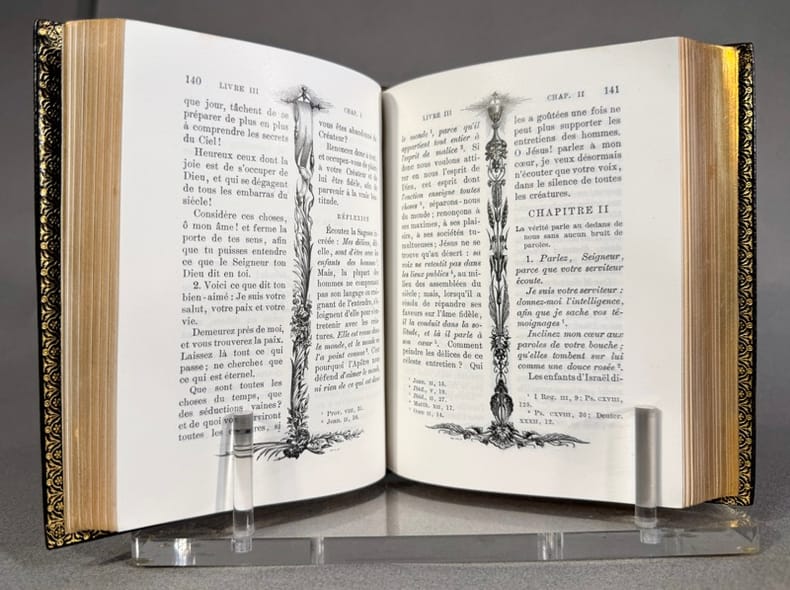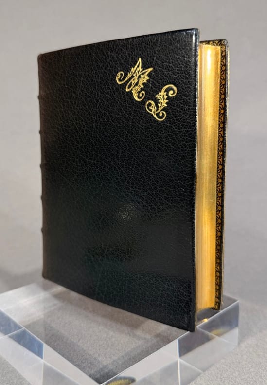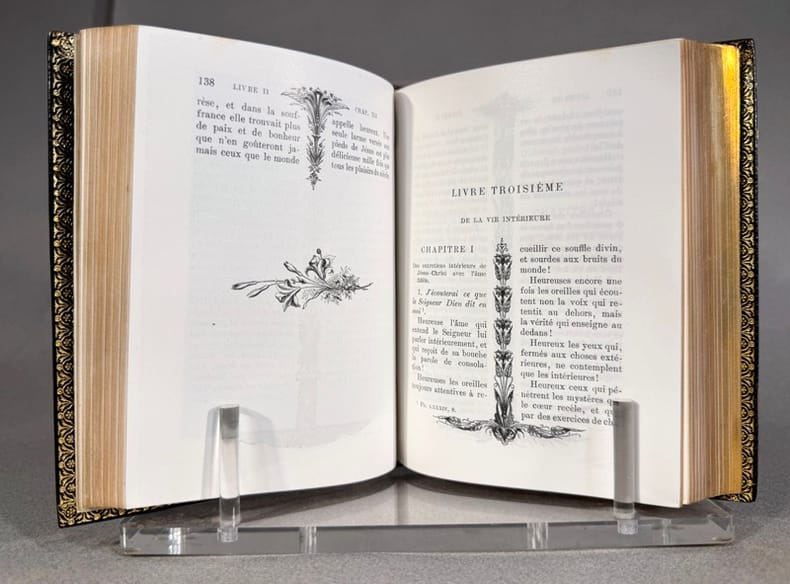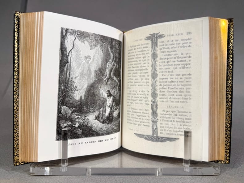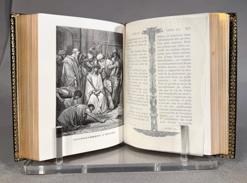Tours Alfred Mame et Fils, 1888 In12, 466pp plein maroquin bleu nuit glacé, dos rond à cinq faux nerfs, plat supérieur monogrammé ML, tranches dorée, dentelles intérieurs et pages de gardes à motifs de fleurs de vigne or sur fond bleu nuit. Illustré de 16 gravures belles et fines gravures d’après les compositions de Gustave Doré et de d’originales ornements in texte par H. Giacomelli.