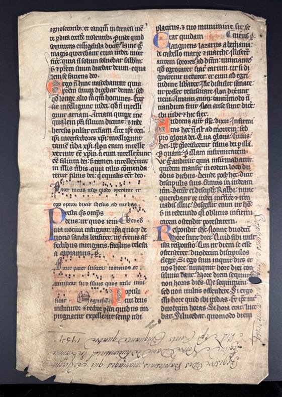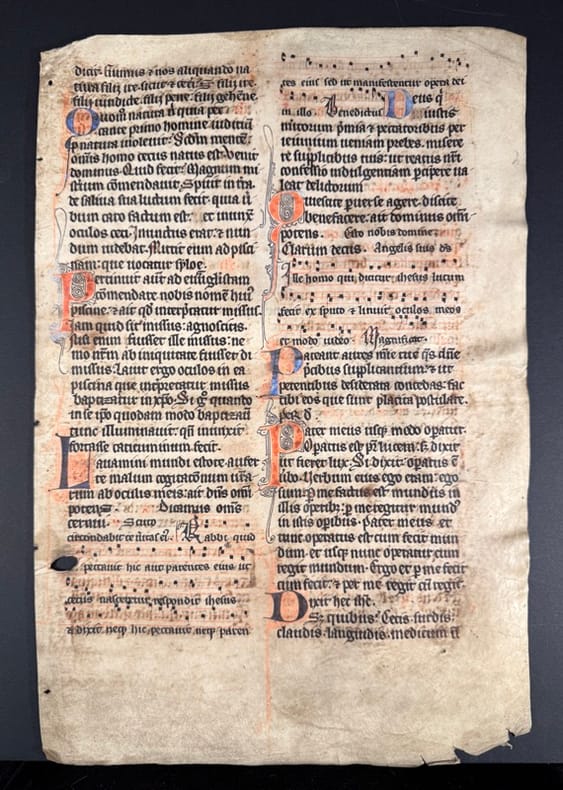 XVe siècle Feuillet manuscrit sur vélin 24x36,5 cm, en deux colonnes, dans une gothique à l’encre noire, agrémenté d’initiales orné rouges et bleues en alternance, et de partitions aux lignes tracés au rouge. Au recto, sept lettrines, au verso six lettrines. Vélin bruni.