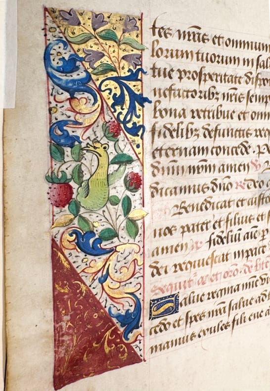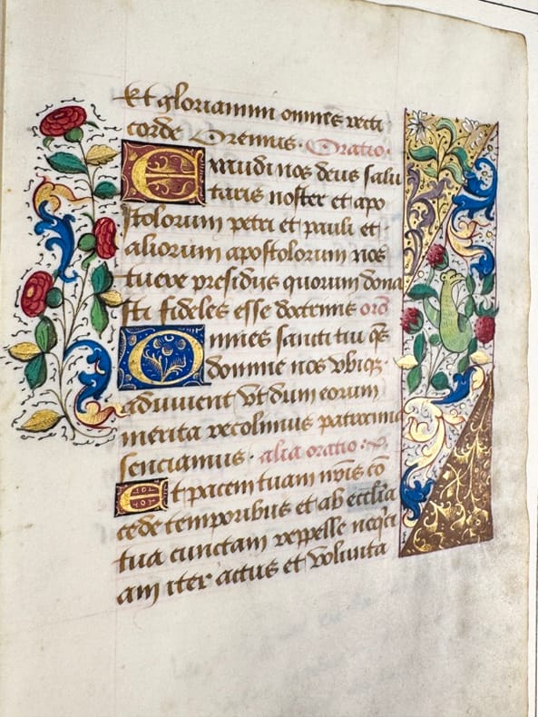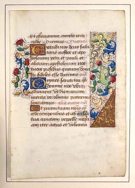 Dernier tiers du XVe siècle Feuillet manuscrit sur vélin fin 14x 9,7 cm, extrait d’un livre d’heures, rédigé à l’encre sepia et rouge, dans une petite batarde, agrémenté de quatre jolies initiales à l’or liquide sur fond alterné rouge et bleu, réhaussé de très fines touches d’or liquide à thème d’acanthes et de fleurettes. La marge de gauche au recto, est illustré de roses et acanthes, la marge de droite, est composée d’un fond compartimenté à l’or liquide à l’or liquide et aux gouaches, orné d’acanthes marguerites, fraises, et d’un très amusant grotesque en dégradé de vert. Au verso par utilisation de la transparence du vélin, une reprise du thème précédent avec quelques variantes, fond compartimenté alterné d’or liquide et de gouache rouge , avec fleurs de lys acanthes et fraises, et le même grotesque, vivement brossé provoquant un effet comique assez réussi…