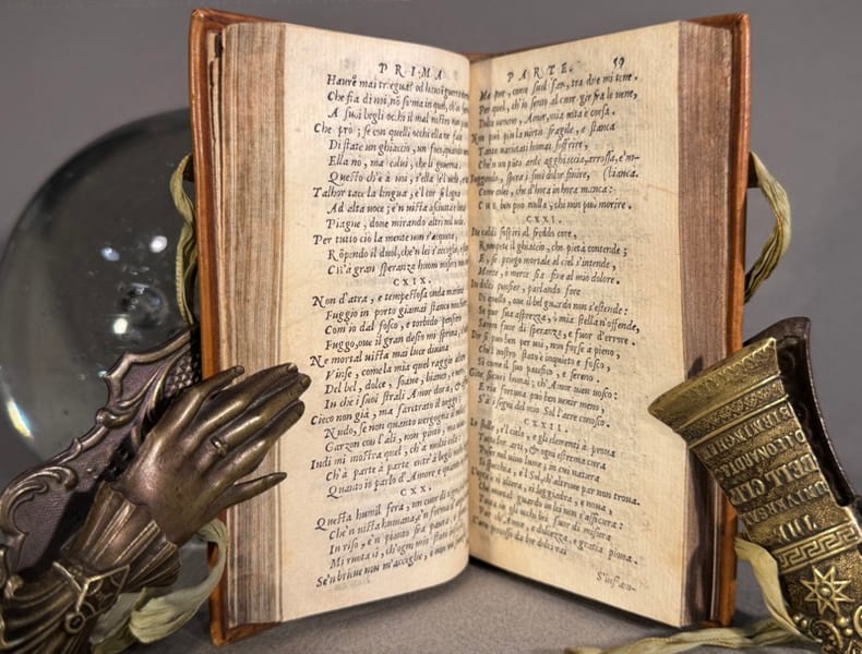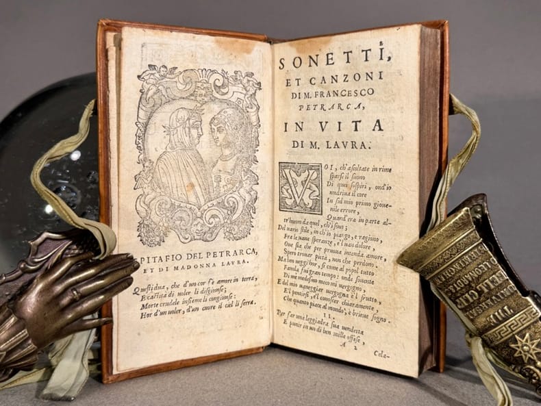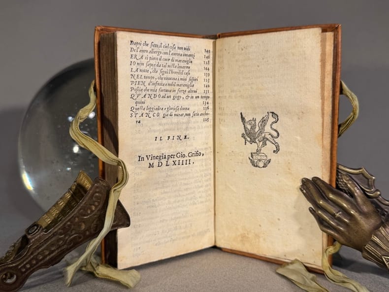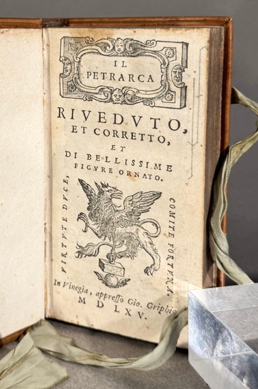 Belle marque de Griffe illustré d’un beau griffon gravé sur bois en page de titre, et au verso un bois gravé représentant Pétrarque et Laura dans un encadrement en forme de cœur orné d’angelots. Les sonnets et chants de Pétrarque occupent les 122 premiers feuillets et sont suivis des Triomphes de Pétrarque. Chaque triomphe est précédé par une gravure sur bois.