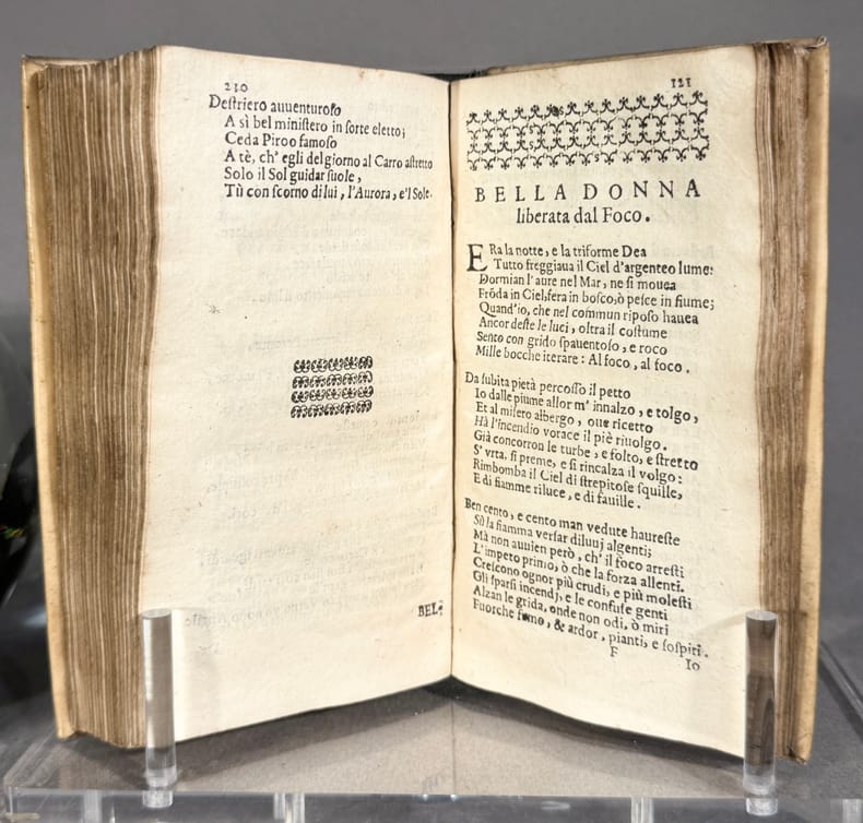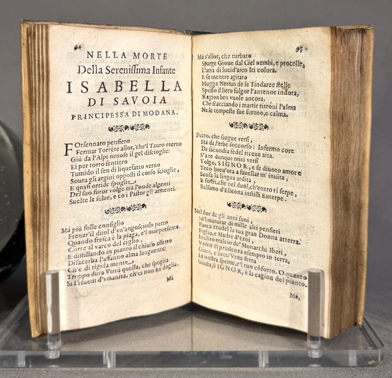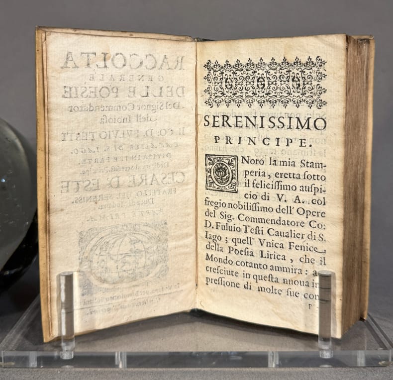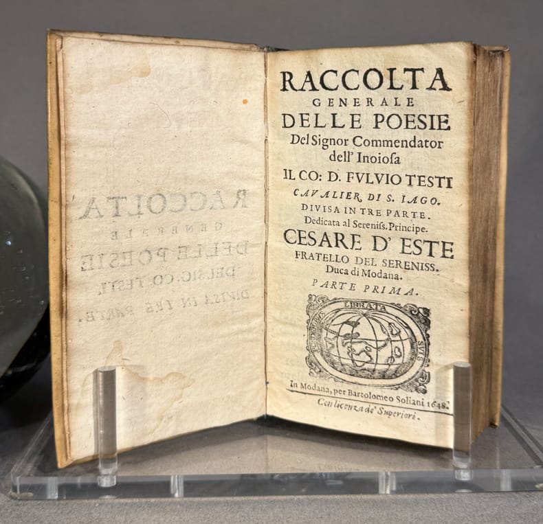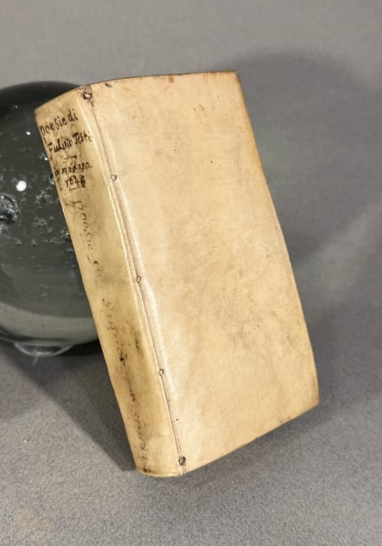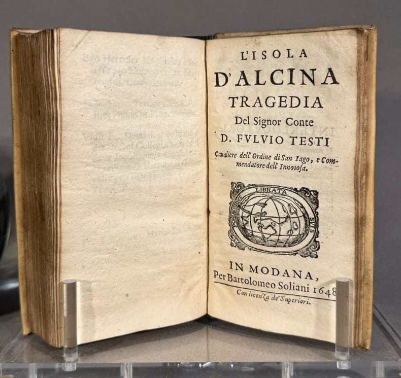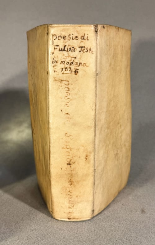 In Modana, per Bartolomeo Soliani 1648 / Tercia partia : In Bolonia per Carlo Zenero, 1648 1648 In 12 en plein vélin d’époque. 155pp ; 142pp ; 198pp ; suivi de 45ppFulvio Testi 1595-1646 poète italien, tour à tout poète de cours et ambassadeur, il eut un parcours particulière chaotique, alternant les honneurs les plus convoités, et disgrâces allant jusqu’à son enfermement et à sa mort. La correspondance secrète que Testis entretins avec le cardinal Mazarin, démasqué par le Duc de Modène qui le fit enfermer. Ses poésies fortes appréciées de son vivant sont un modèle d’élégance parfois mêlé d’extravagance, telle cette courte tragédie ajoutée en fin de volume sur le thème de « L’isola d’Alcina ». Alcina, magicienne, détient dans son ile le cavalier Ruggiero dans son jardin peuplé de plates exotiques qui sont en réalité les anciens amants de la magicienne…