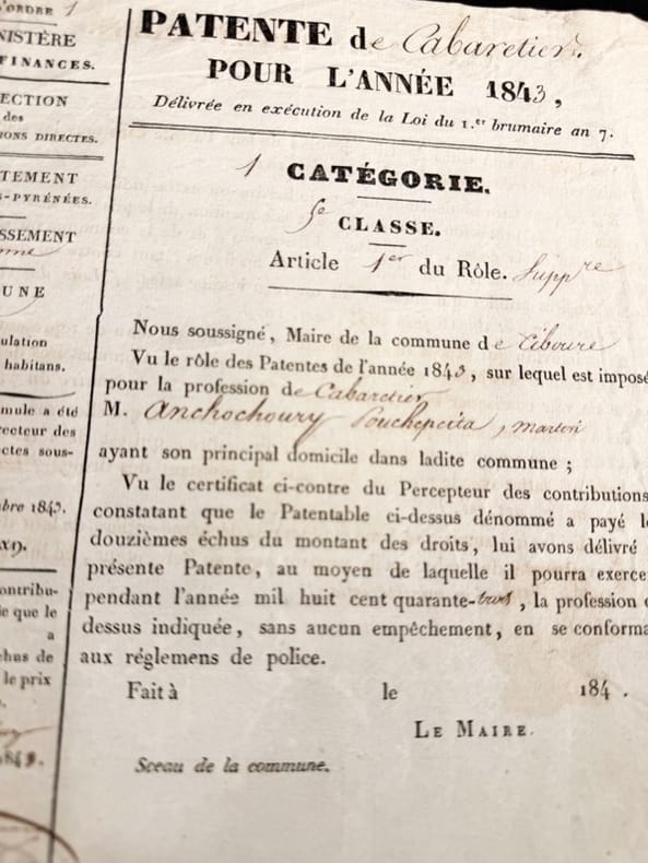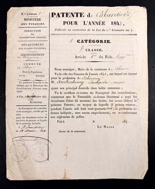 18 Décembre 1843 1796 Ministère des finances. Direction des contribution directes. Département des basses-Pyrénées ; Arrondissement de Bayonne ; Commune de Ciboure.Martin Anchochoury né en 1796 à Ciboure, après une vie de Marin et de pêche à la Baleine, une fois débarqué, ouvre un cabaret dans sa ville natale de Ciboure en 1843. La pension de famille Anchochoury existe encore de nos jours et fut notamment le point de chute de la nouvelle peinture impressionniste Basque dans les années 1920.
