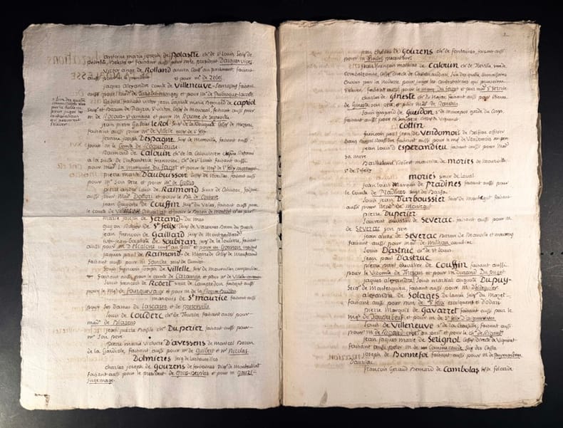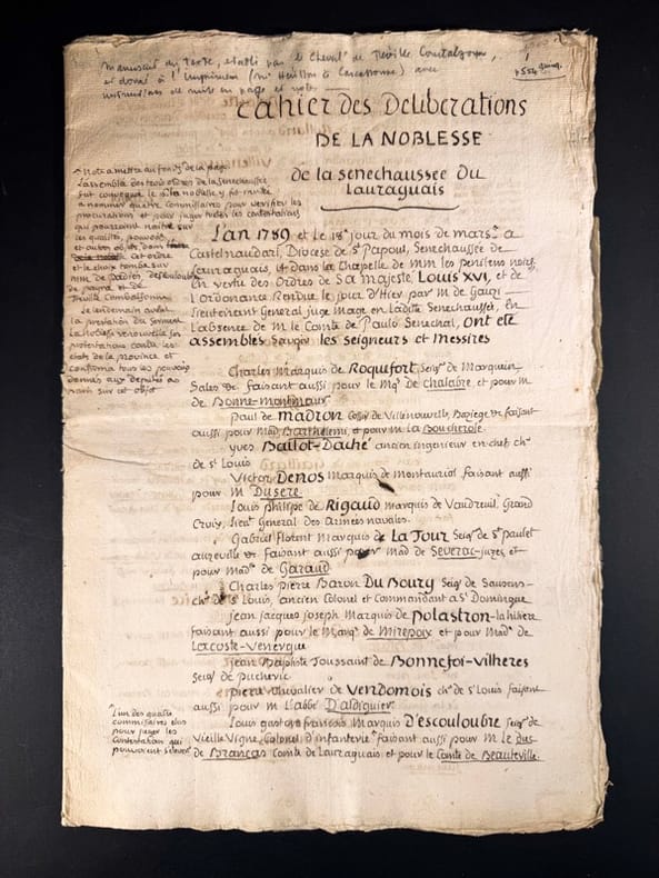 Manuscrit raturé et mis au net, rassemblant les doléances du parti de la noblesse pour la région de Lauragais, qui correspond à une zone comprise entre Toulouse, Carcassonne, Castre et Pamiers.8 pages in-folio. Rendant compte de l’élection du marquis de Vaudreuil en tant que député représentant la région à l’assemblée nationale.