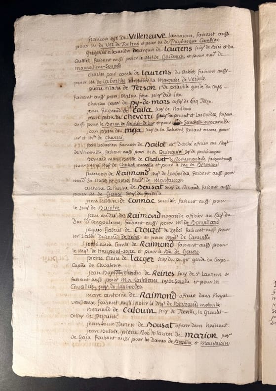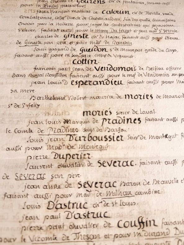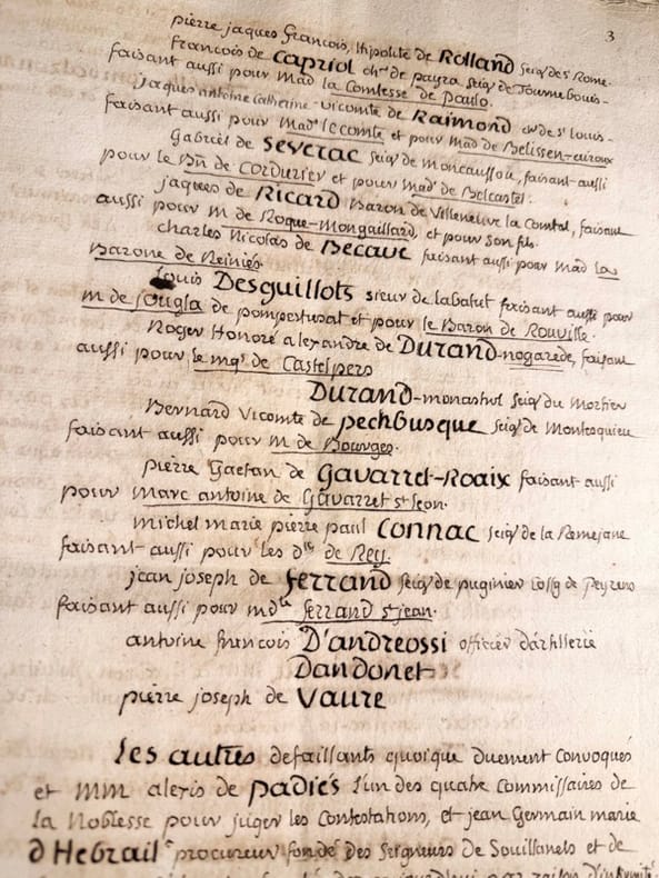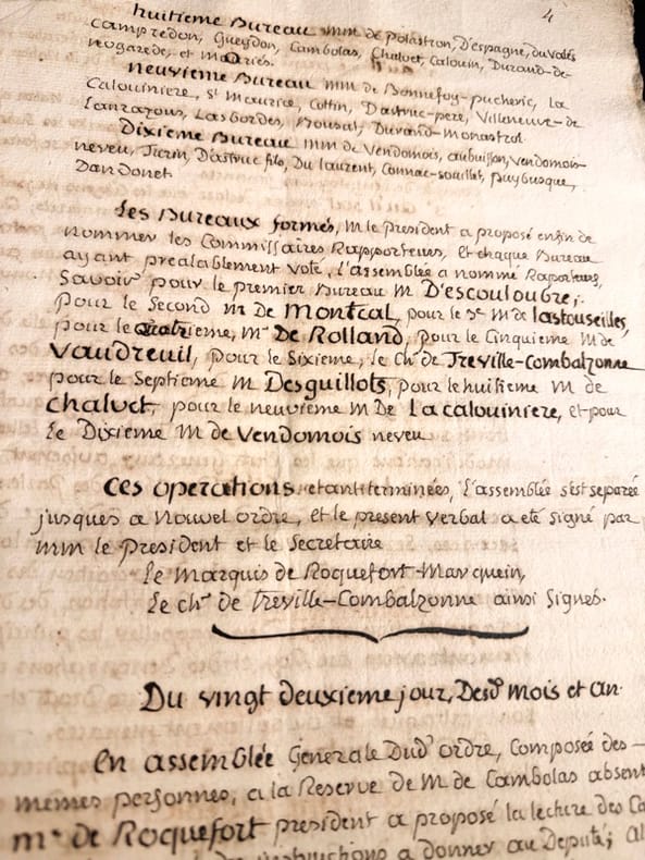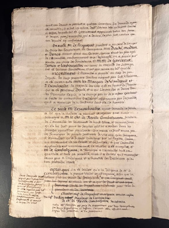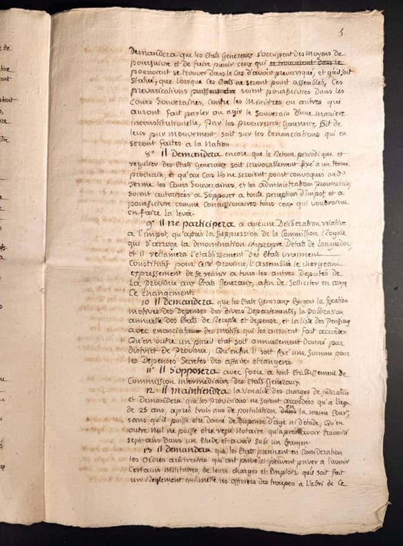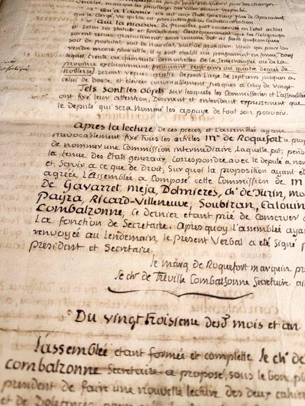 Le manuscrit s’achève sur cette précision qui nous éclaire sur la nature de ce document « après quoi il a été délibéré qu’à la diligence de Monsieur de Combalzonne (Chevalier de Tréville de Combalzonne). Le présent verbal seroit imprimé, afin que la noblesse put en avoir des exemplaires (…) Il s’agit donc un acte de mise au net de délibérations dans lequel quelques corrections de derniers instants ont été portés en marge dont voici quelques exemples dont une note précisant que l’assemblée des trois ordres de la sénéchaussée décida que la noblesse fut invitée à nommer quatre commissaires pour vérifier toutes les procurations et contestations éventuelles.P7 : chapitre 6, La Noblesse se définit ainsi, que la noblesse ne puisse plus s’acquérir par des charges vénales et qe les privilèges de villes soient respectés. La mention prouvant cent ans ou quatre degrés de noblesses soit retiré. Elle demande également qu’à l’avenir aux états généraux la noblesse ai plus de représentants que de clergé vu qu’elle est plus intéressée à l’administration. Elle demande en ce qui concerne le commerce la suppression et abolition de tous privilège exclusif en matière de commerce établit, ainsi que la libre circulation des grains da tout le royaume »Très beau document, parfaitement lisible car destiné à l’impression.