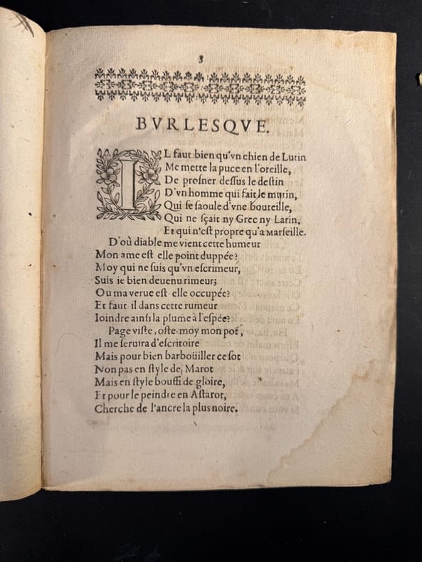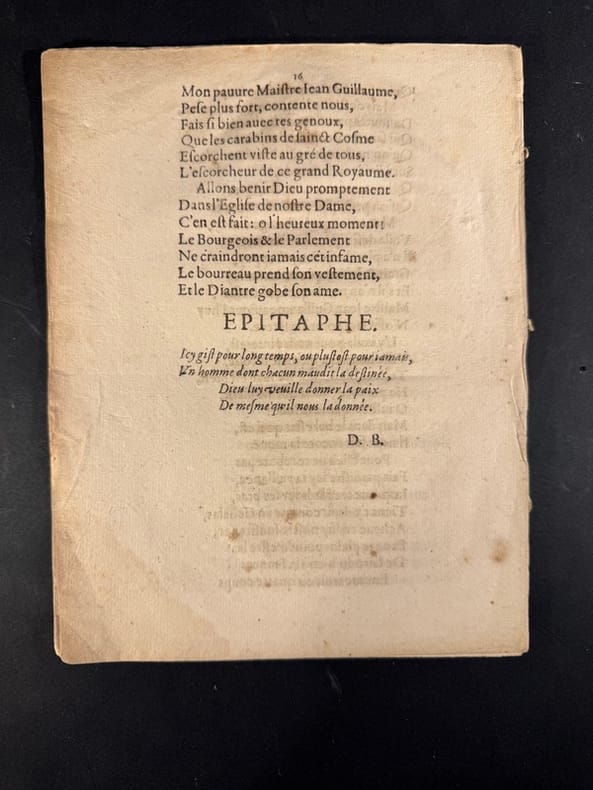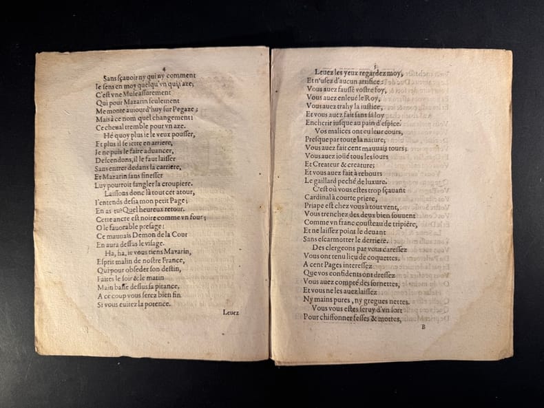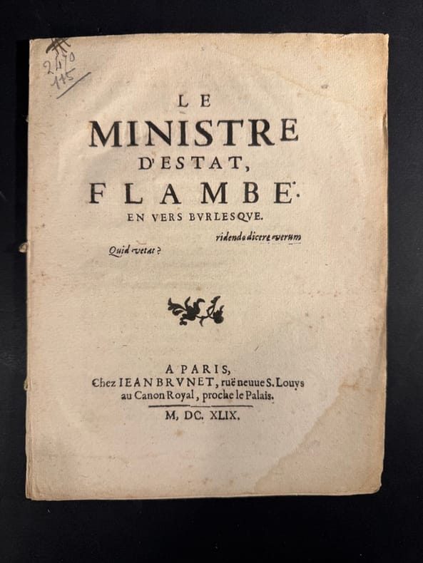 A Paris, chez Jean Brunet rue neuve S. Louys au Canpon Royal, Proche Palais. 1644 In 4 broché, 16 ppFameuse Mazarinade attribué à Jacques Savinien de Cyrano de Bergerac Parmi les sept mazarinades signées D.B., Le Ministre d’État Flambez est la plus truculente et la plus célèbre. Parmi l’énorme production de Mazarinades qu’enfantât la Fronde (plus de 6000 pièces recensées) seule une quinzaine d’entre elles retinrent l’attention. Dont ce rare pamphlet fait office de figure de proue. C’est Paul la croix le premier qui en 1858 attribua à Cyrano le Ministre d’Esta Flambez. En 1921 F. Lachevre y rajouta quatre autres pamphlets portant cette même initial « D.B. » et « B.D. » Portant l’épitaphe célèbre sur le décès supposé (souhaité) du cardinal de Mazarin :« icy jist pour longtemps, ou plustot, pour iamais, Un homme dont chacun maudit la destinée, Dieu luy veuille donner la paixDe mesme qu’il nous l’a donné » Rare